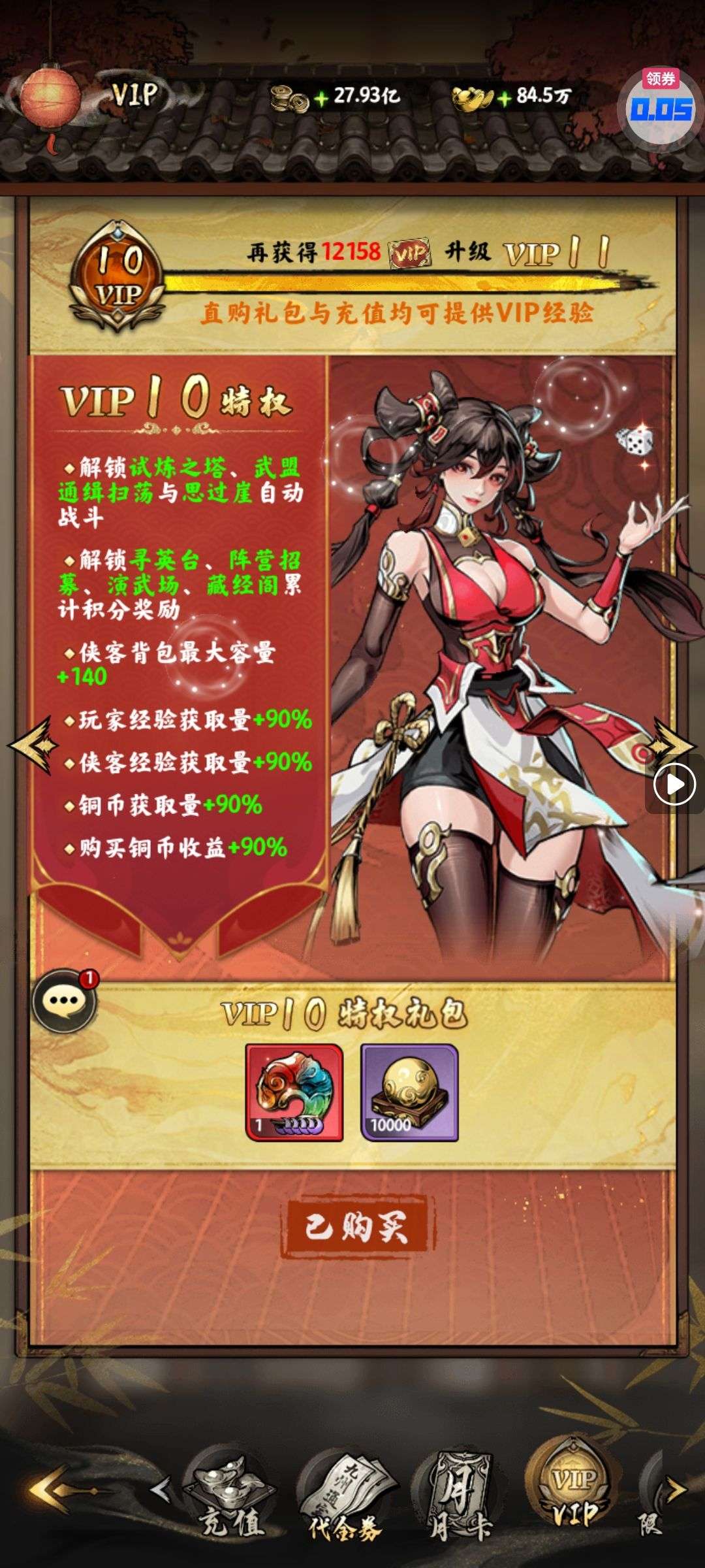 30张648真充卡豪礼、侠客灵丹*10、侠客神丹*10、侠客金丹*1、专属挑战令*1(每个账号限领一次)