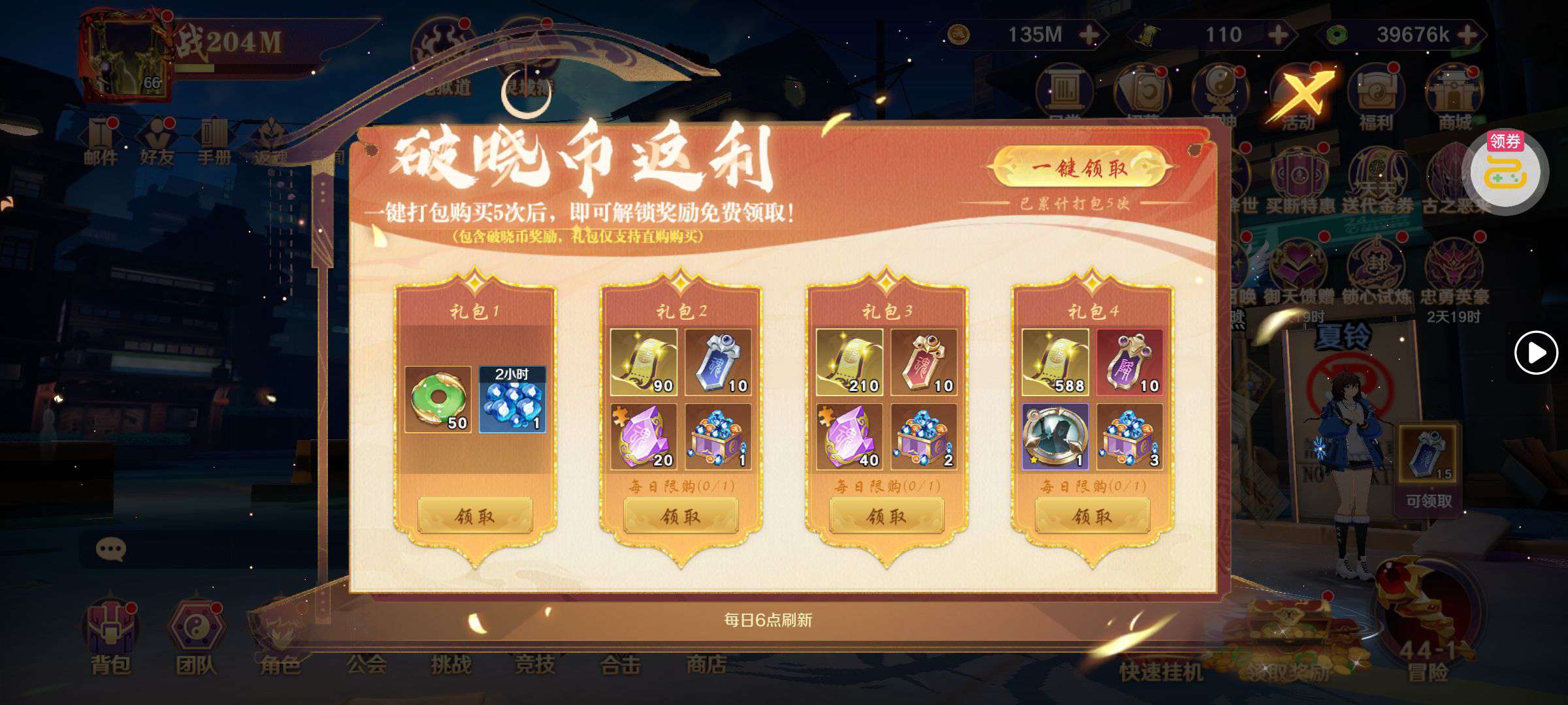 五阵营输出自选包*1、豪华材料自选礼包*2、高级忍法帖*20(每个账号限领一次)
