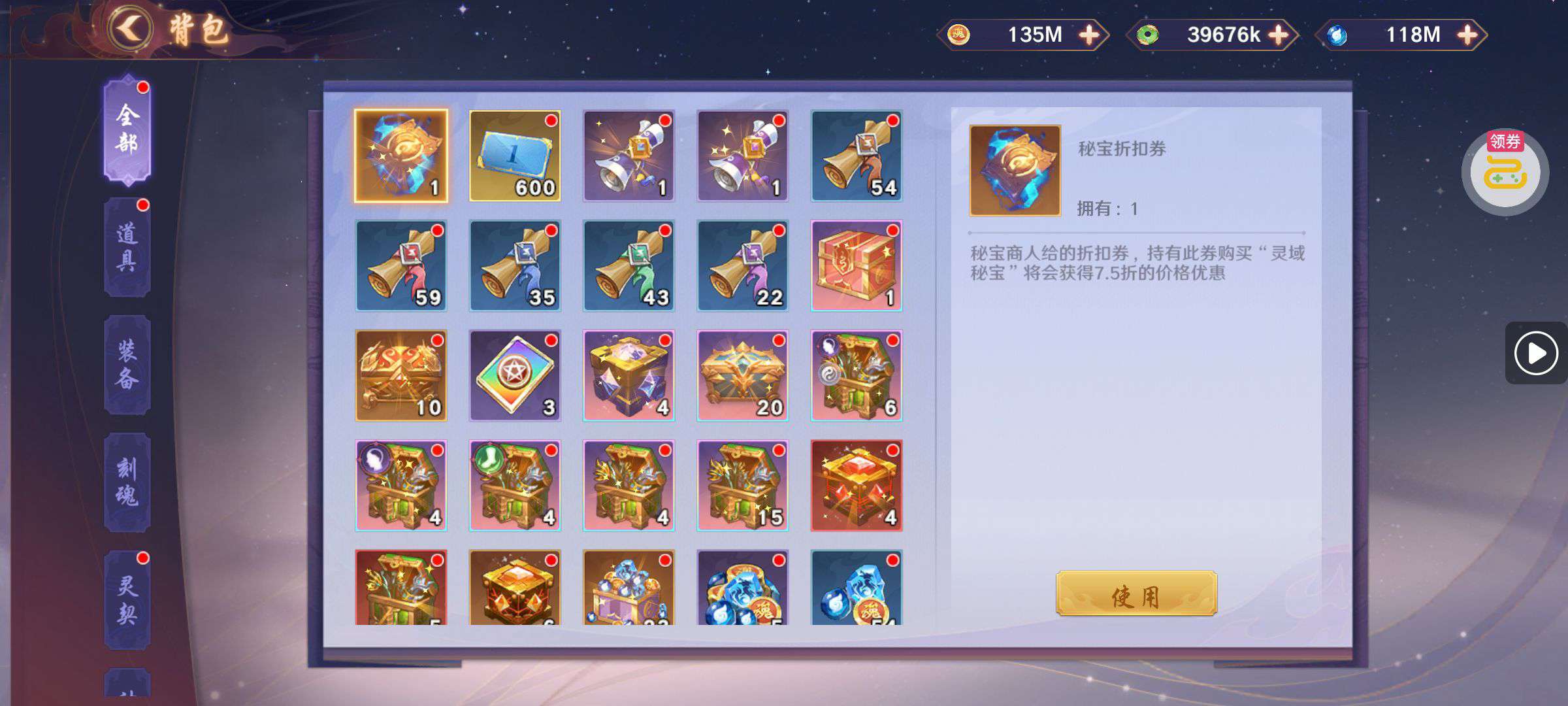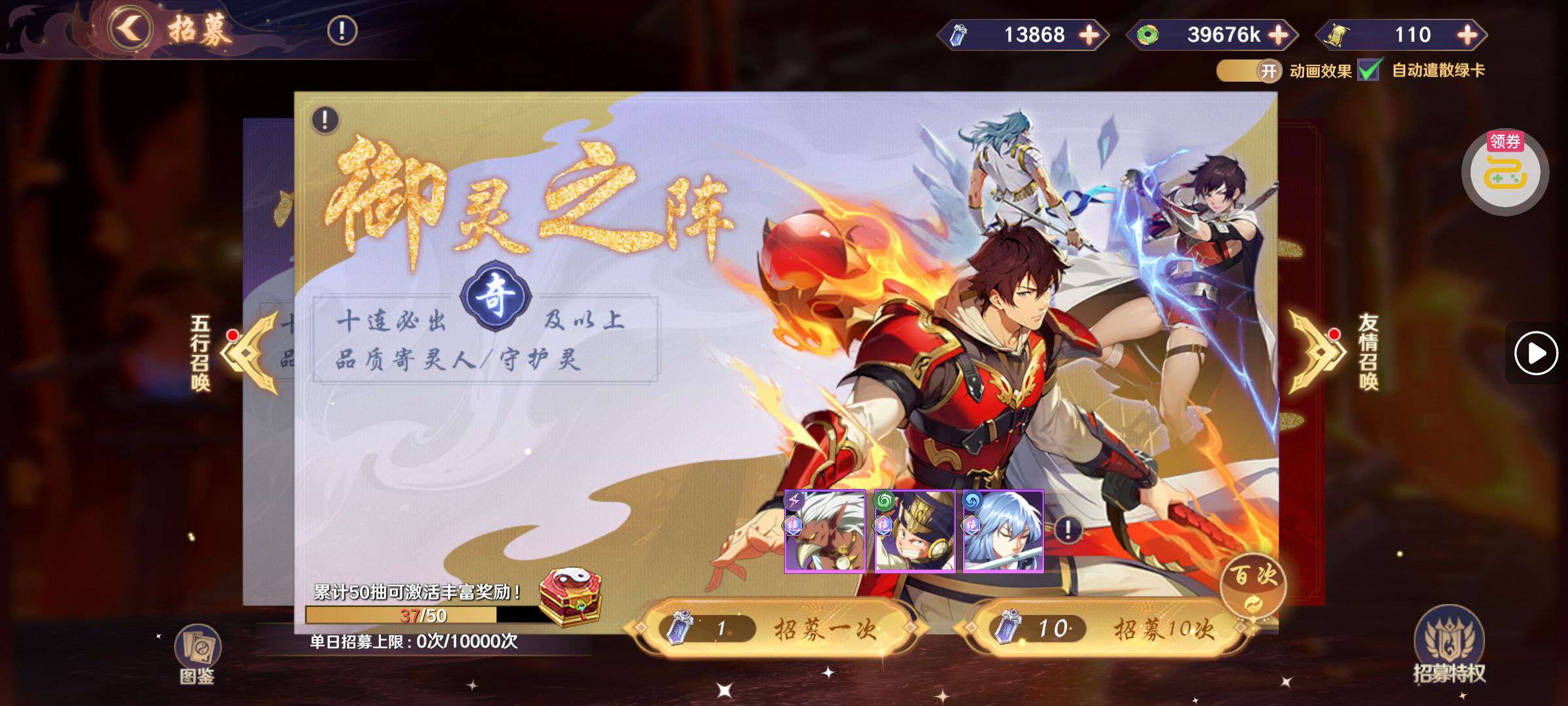 夺宝券*1、比武令*1、5星随机将魂*10(每个账号限领一次)