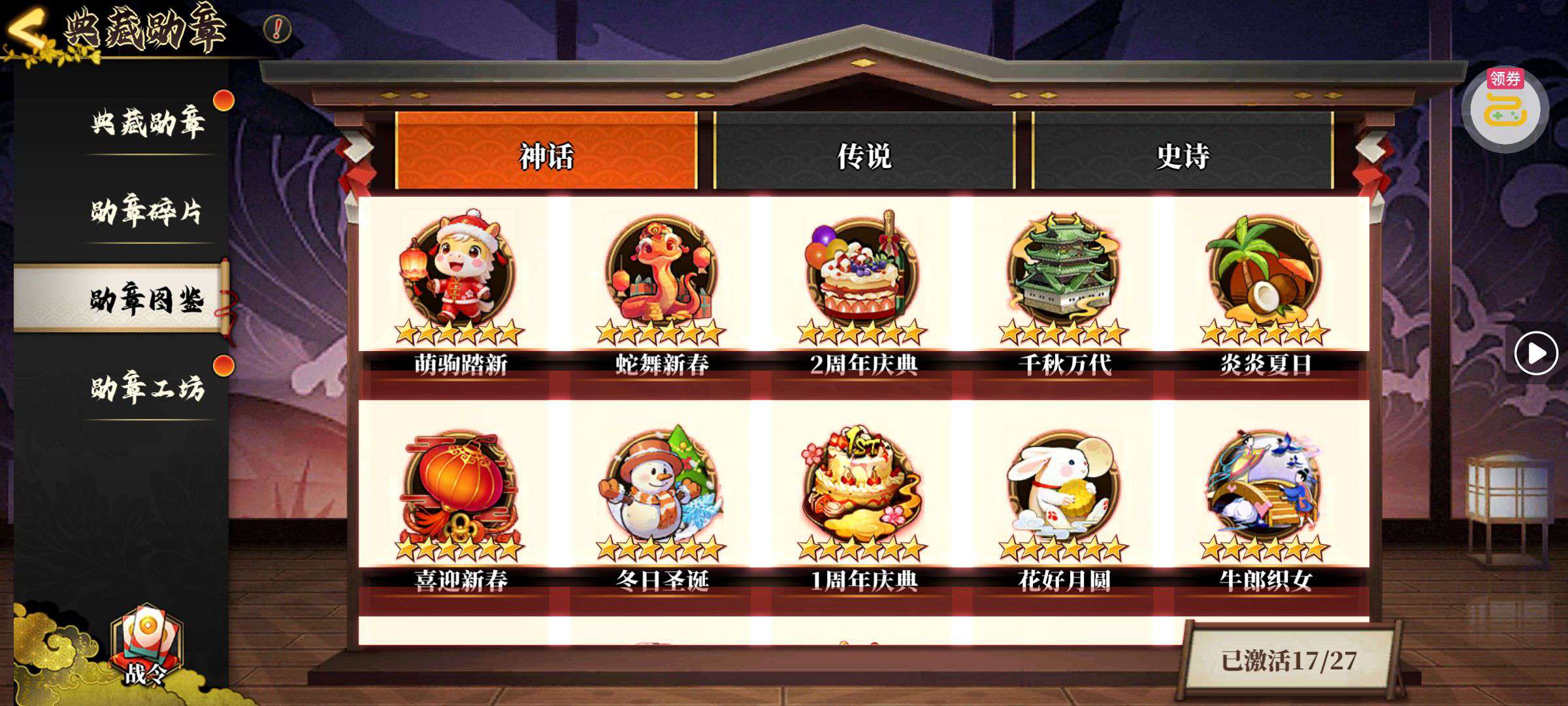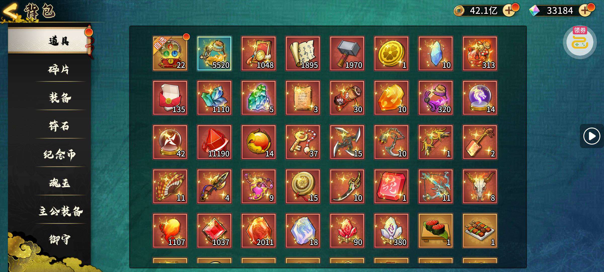 夺宝券*1、比武令*1、5星随机将魂*10(每个账号限领一次)