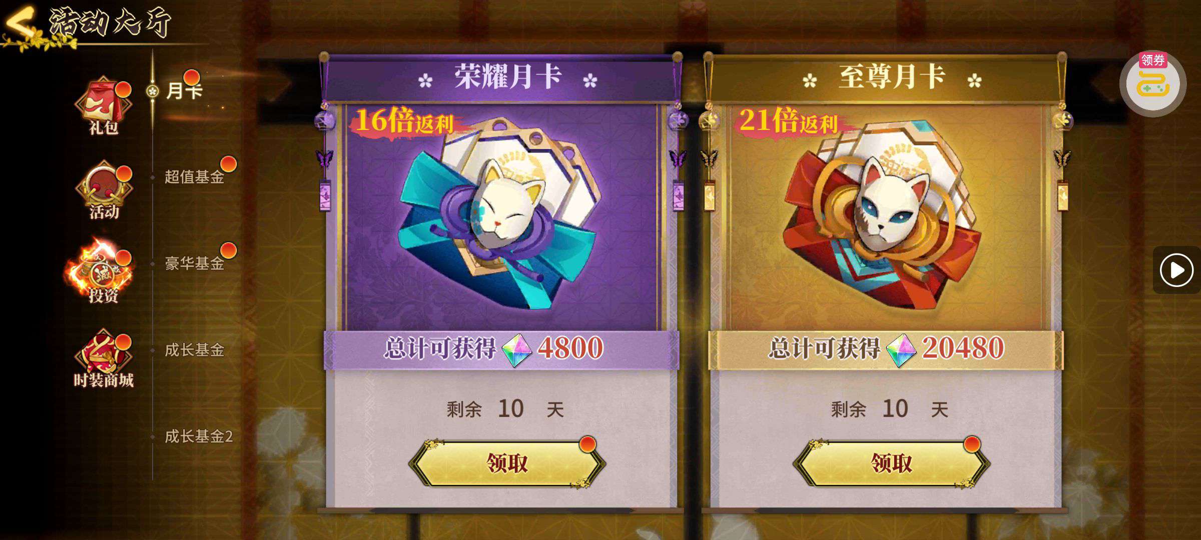 30张648真充卡豪礼、侠客灵丹*10、侠客神丹*10、侠客金丹*1、专属挑战令*1(每个账号限领一次)