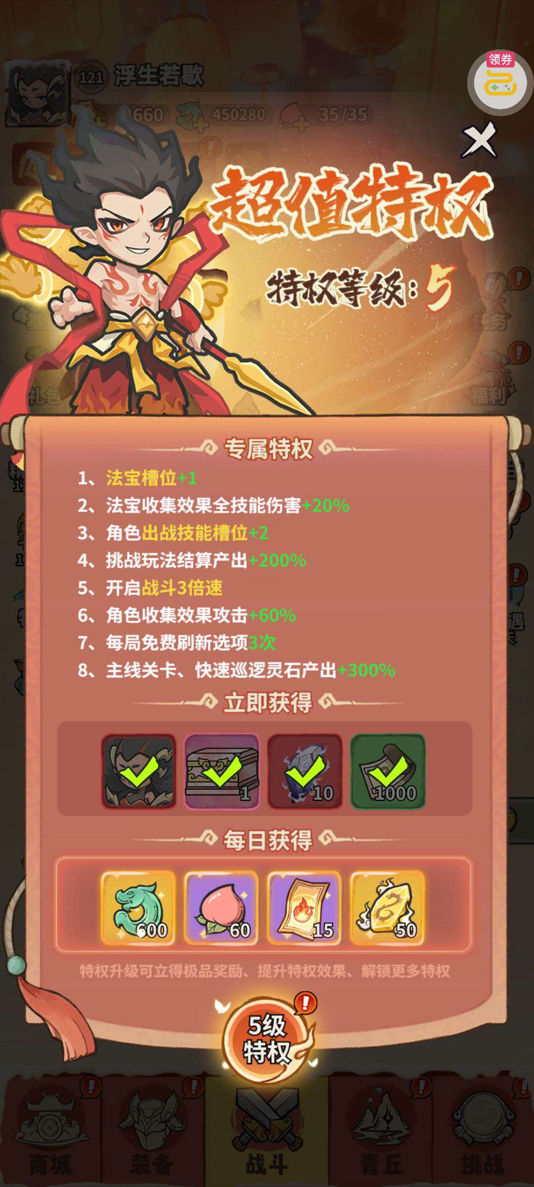 30张648真充卡豪礼、侠客灵丹*10、侠客神丹*10、侠客金丹*1、专属挑战令*1(每个账号限领一次)