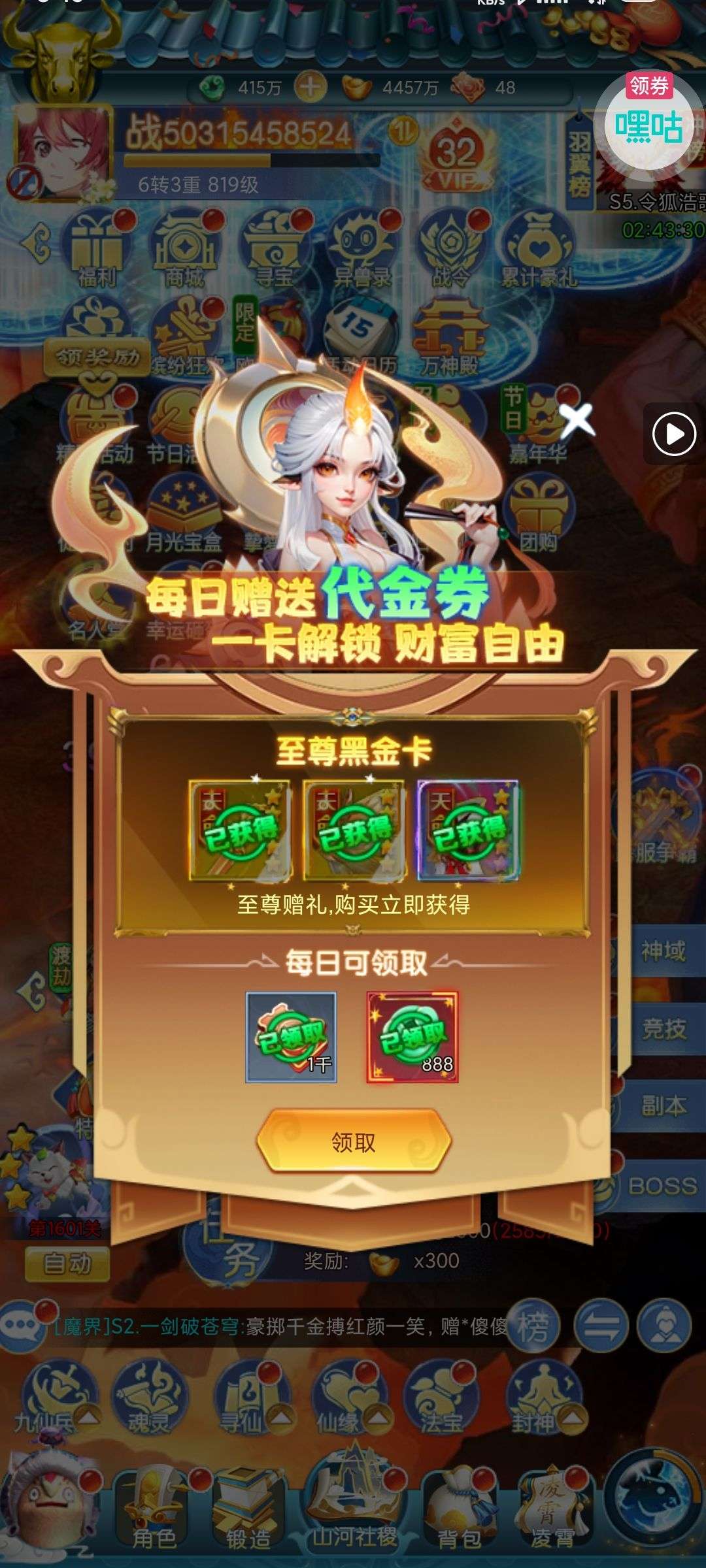 夺宝券*1、比武令*1、5星随机将魂*10(每个账号限领一次)