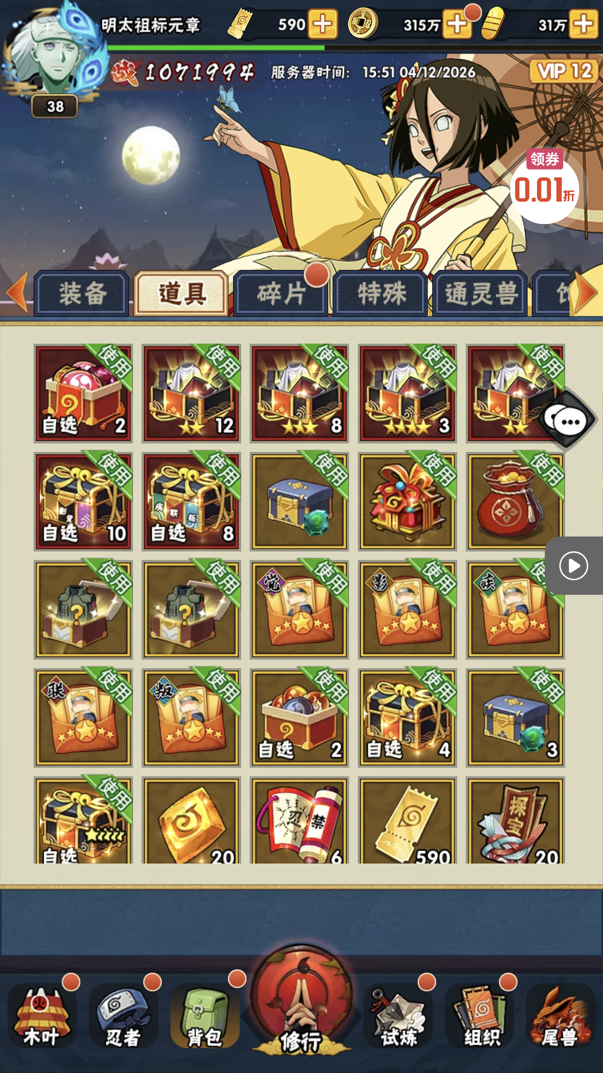 五阵营输出自选包*1、豪华材料自选礼包*2、高级忍法帖*20(每个账号限领一次)
