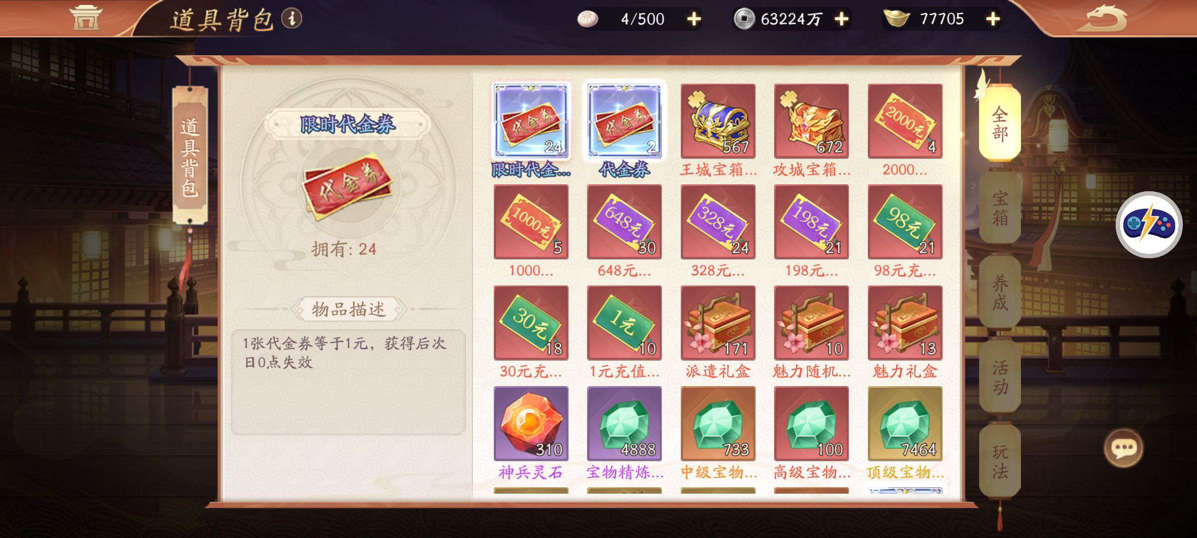 30张648真充卡豪礼、侠客灵丹*10、侠客神丹*10、侠客金丹*1、专属挑战令*1(每个账号限领一次)