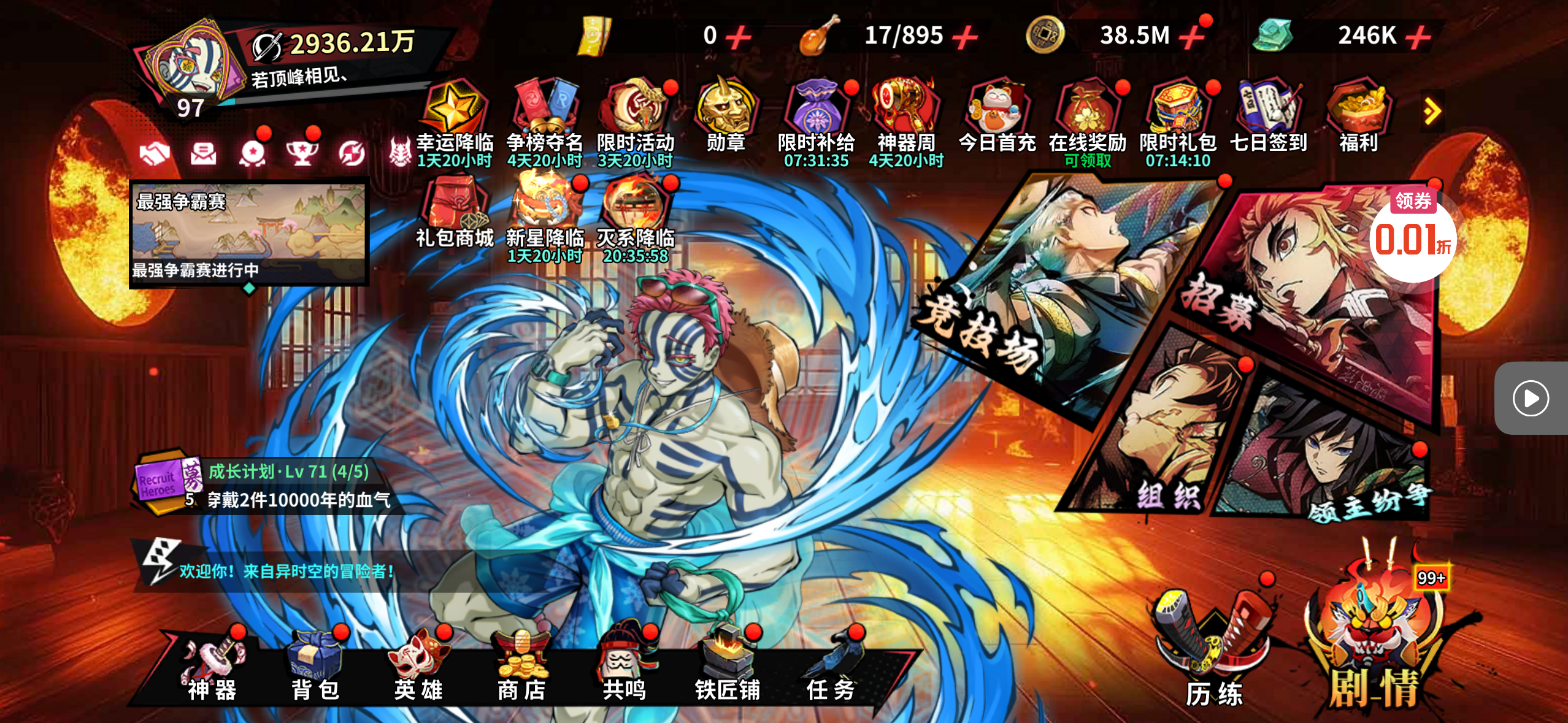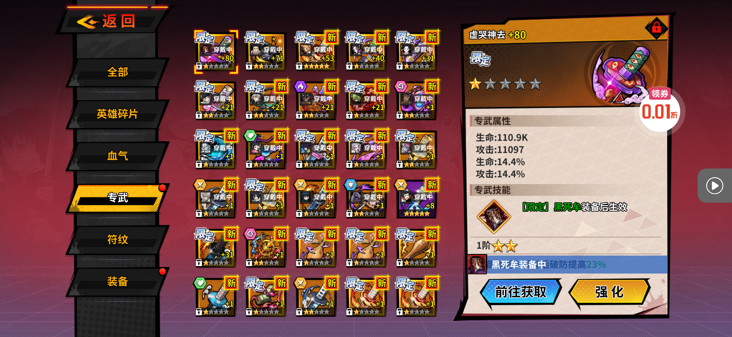 夺宝券*1、比武令*1、5星随机将魂*10(每个账号限领一次)
