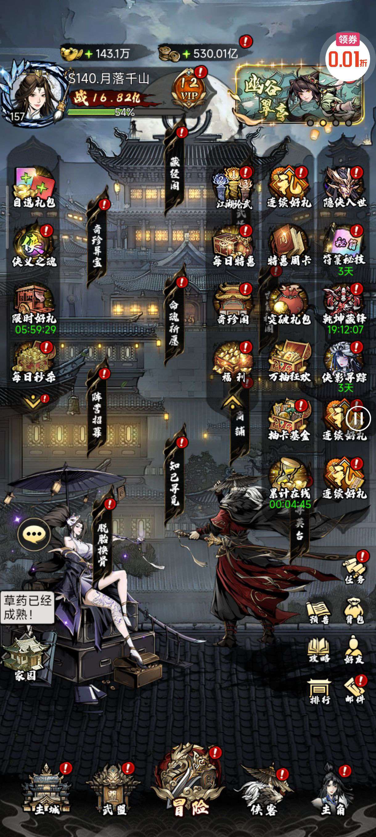 30张648真充卡豪礼、侠客灵丹*10、侠客神丹*10、侠客金丹*1、专属挑战令*1(每个账号限领一次)