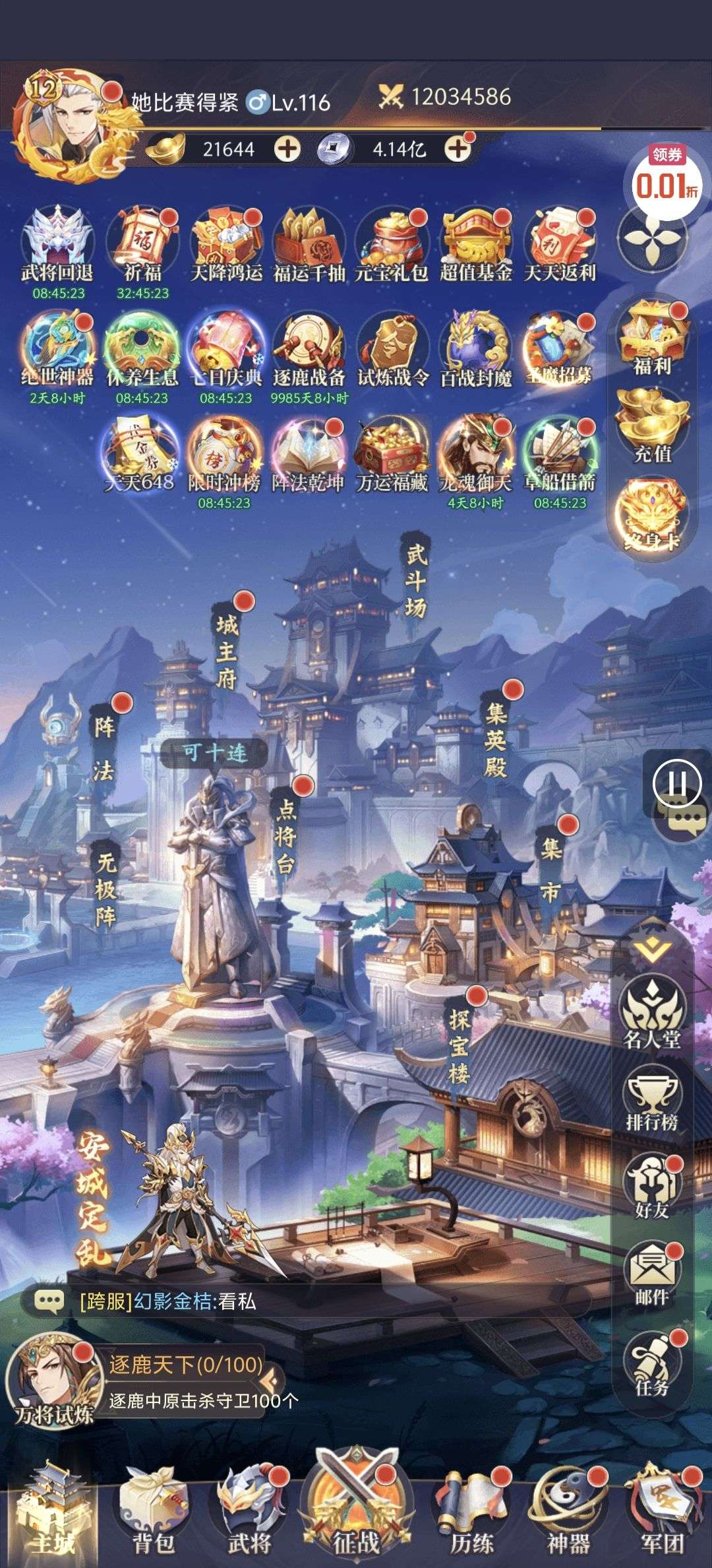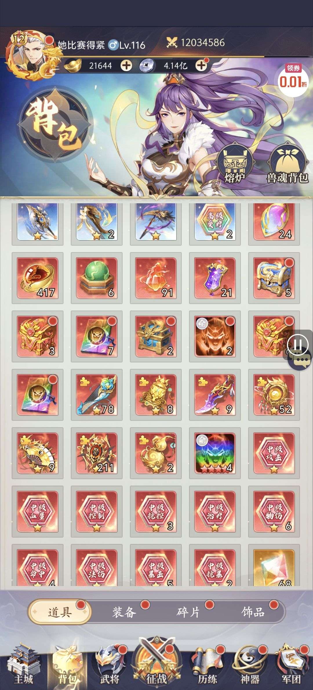 夺宝券*1、比武令*1、5星随机将魂*10(每个账号限领一次)