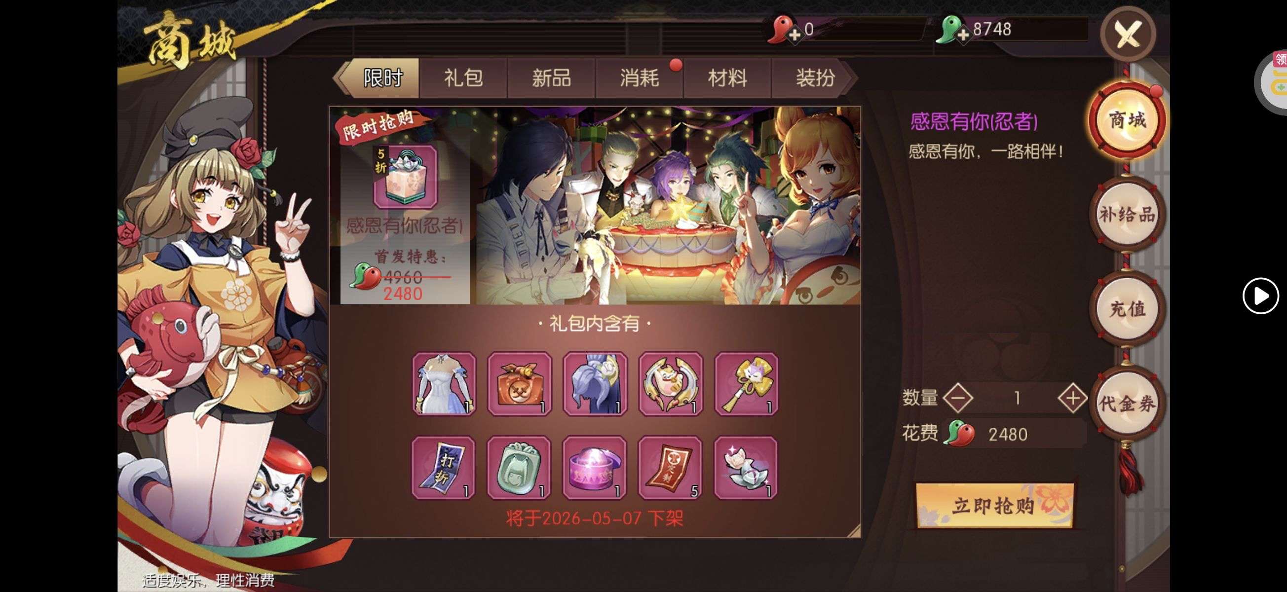 五阵营输出自选包*1、豪华材料自选礼包*2、高级忍法帖*20(每个账号限领一次)