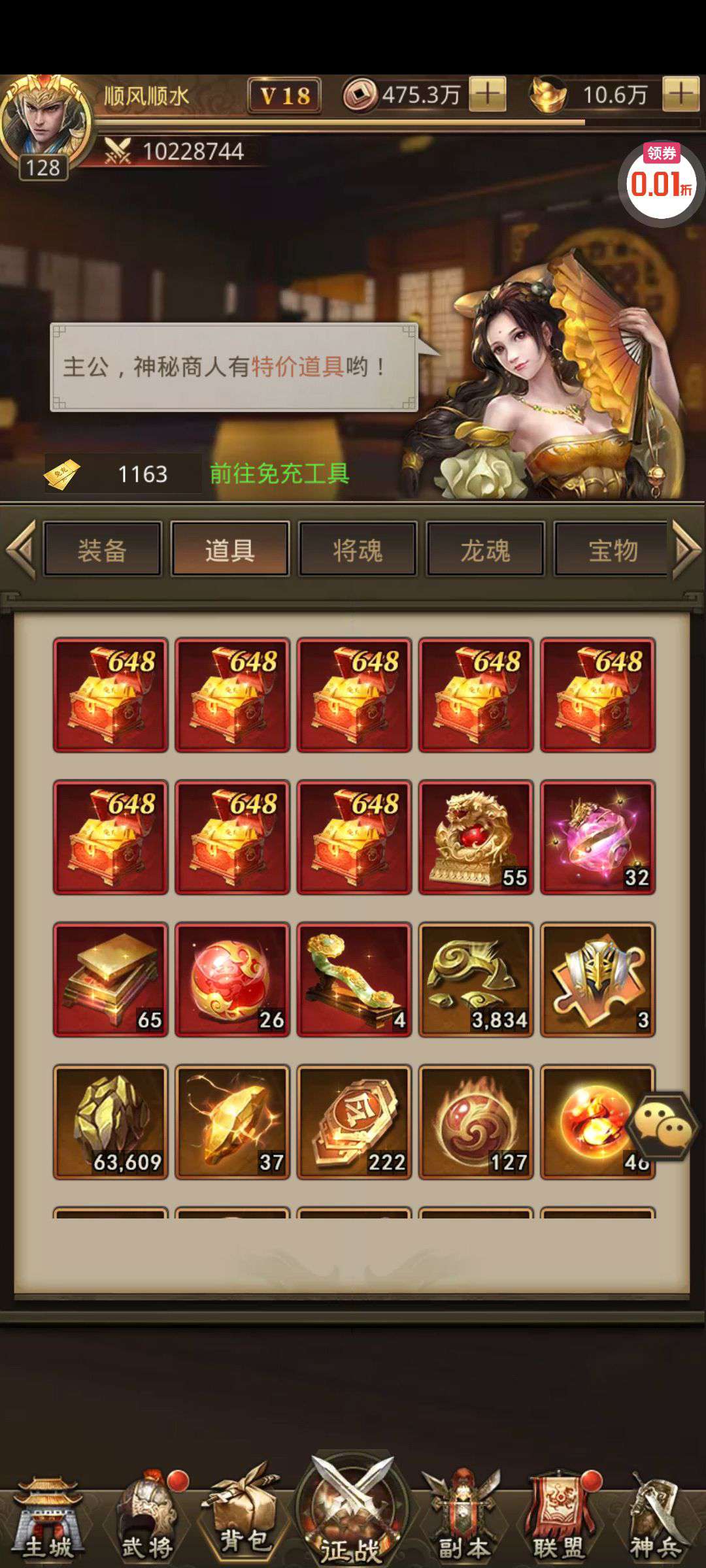 夺宝券*1、比武令*1、5星随机将魂*10(每个账号限领一次)
