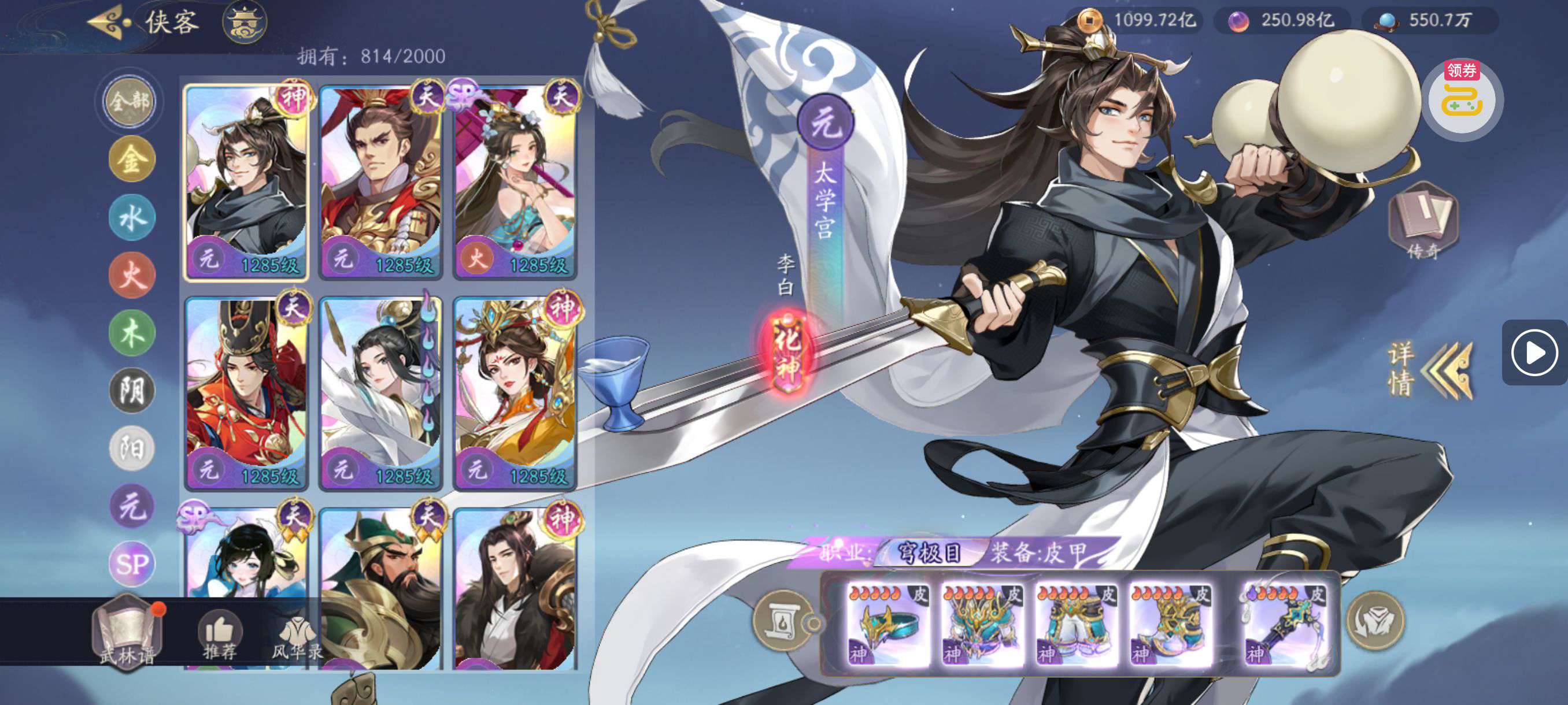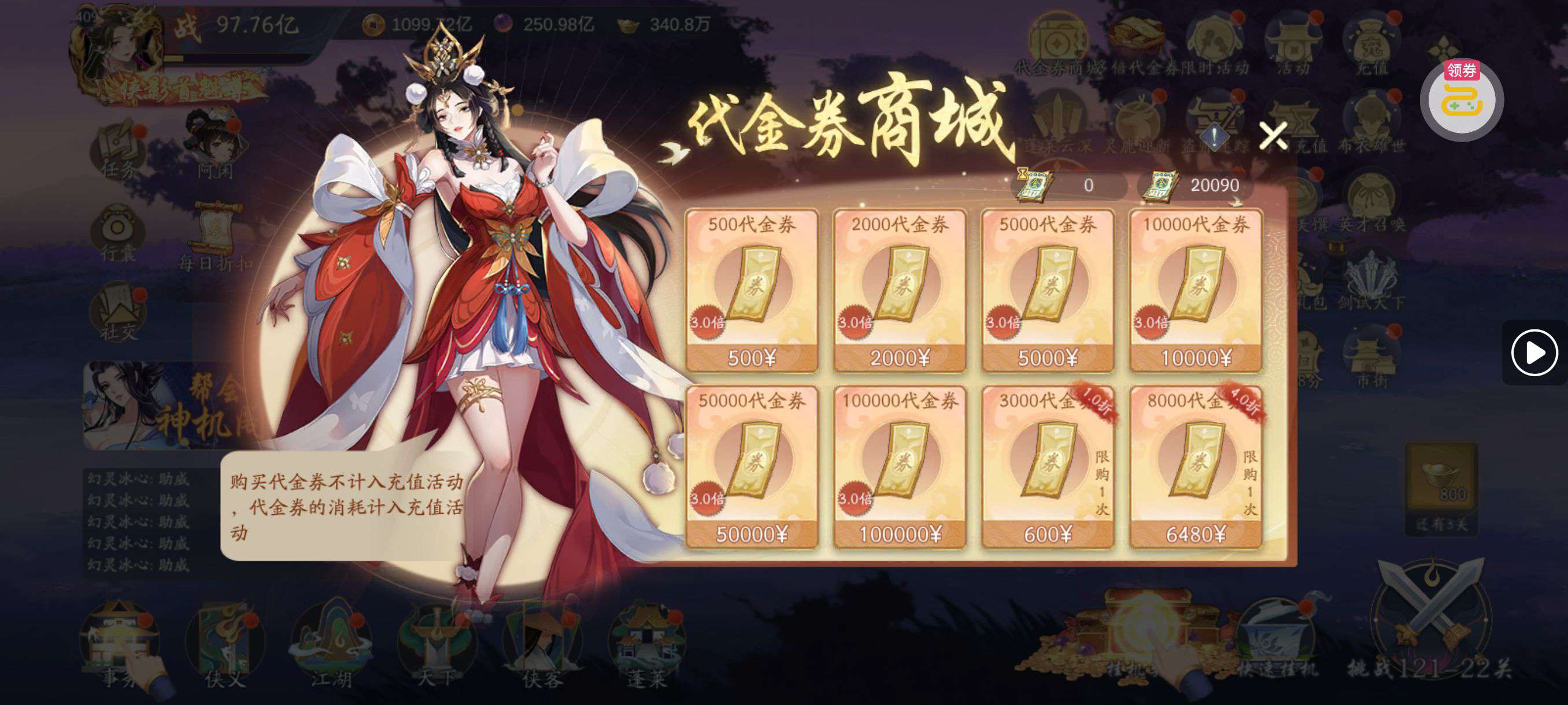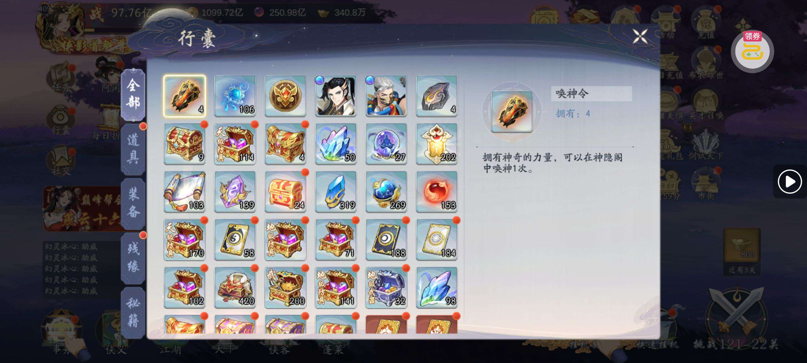 周瑜小乔等丹化神;登仙就差武当没满,五级侠隐一级托,代金劵还有60w多点,号已成型资源多,善待!
