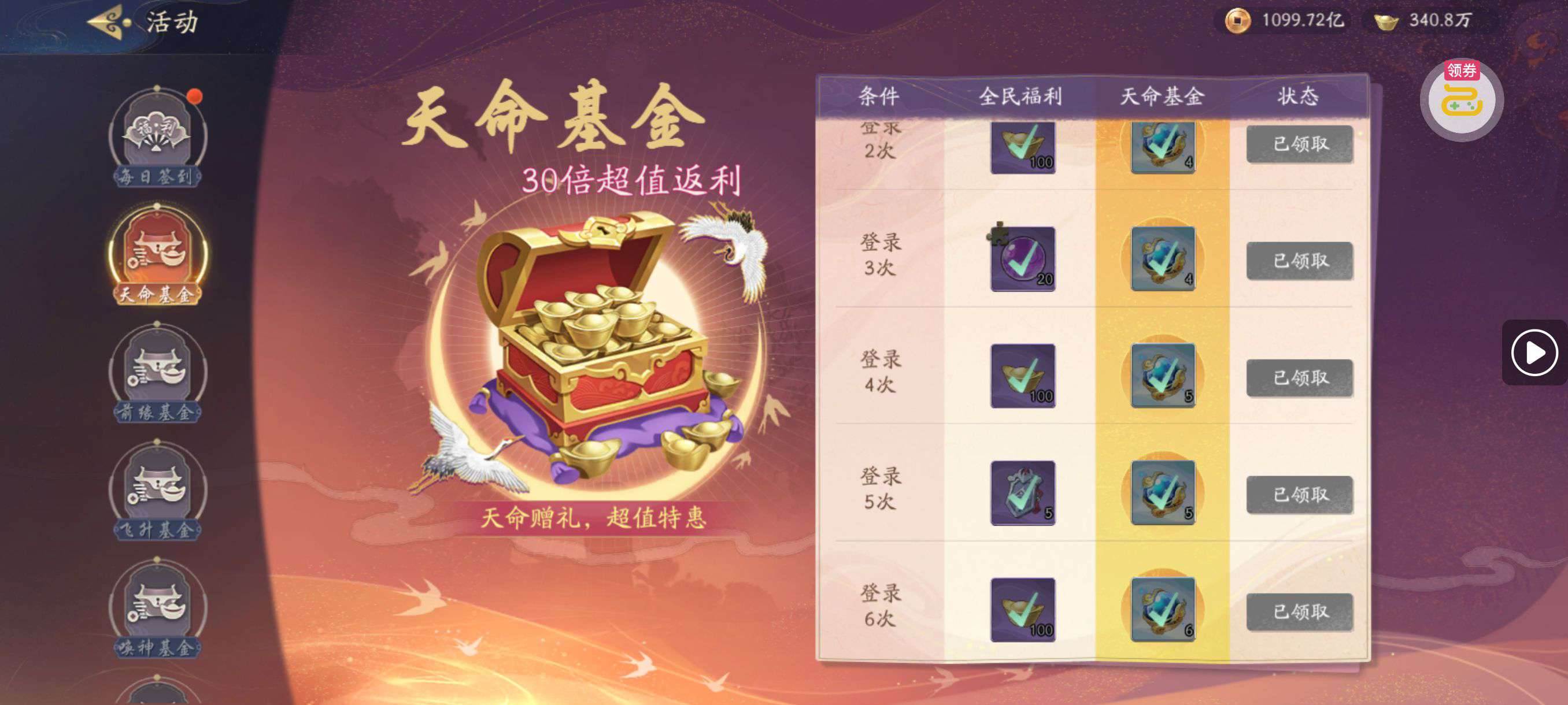 夺宝券*1、比武令*1、5星随机将魂*10(每个账号限领一次)