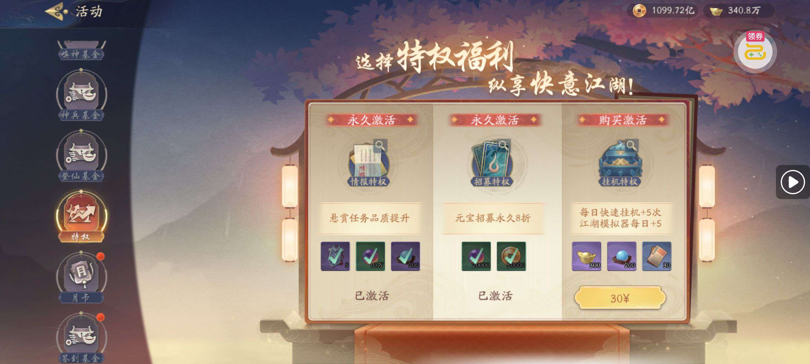 30张648真充卡豪礼、侠客灵丹*10、侠客神丹*10、侠客金丹*1、专属挑战令*1(每个账号限领一次)
