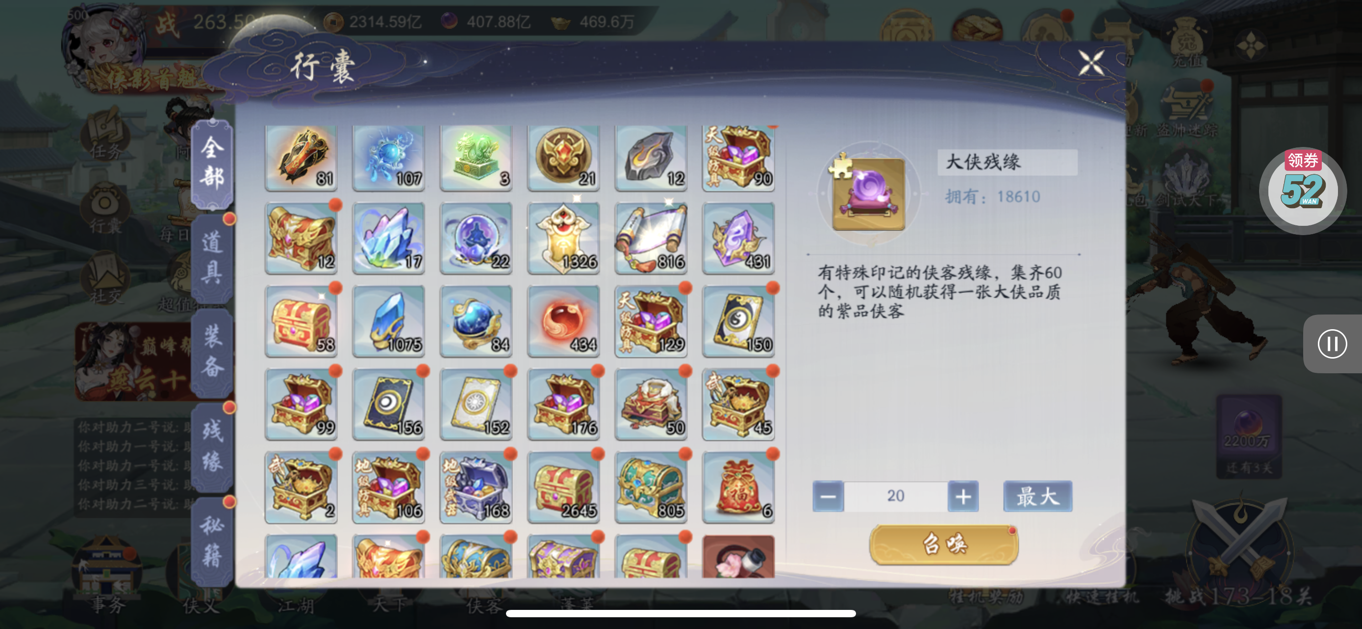 30张648真充卡豪礼、侠客灵丹*10、侠客神丹*10、侠客金丹*1、专属挑战令*1(每个账号限领一次)
