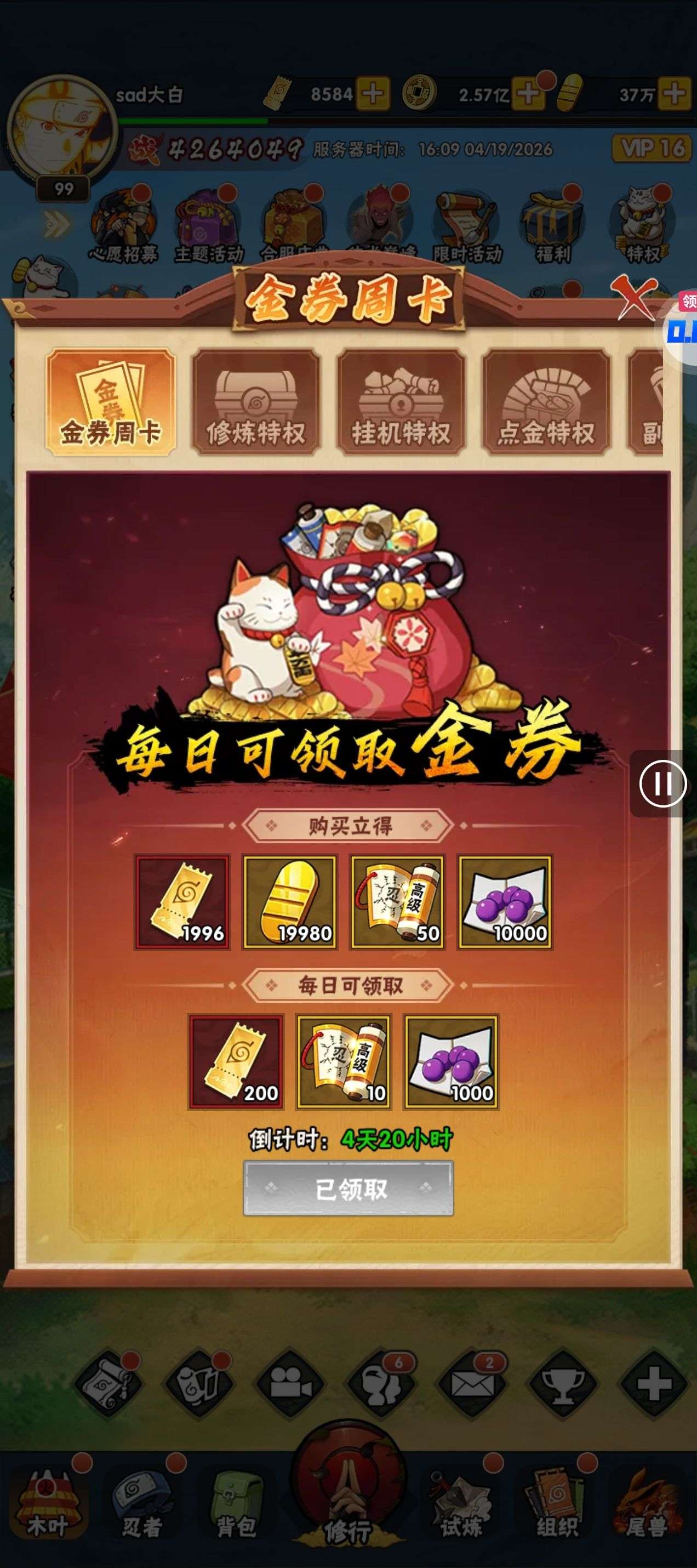 五阵营输出自选包*1、豪华材料自选礼包*2、高级忍法帖*20(每个账号限领一次)