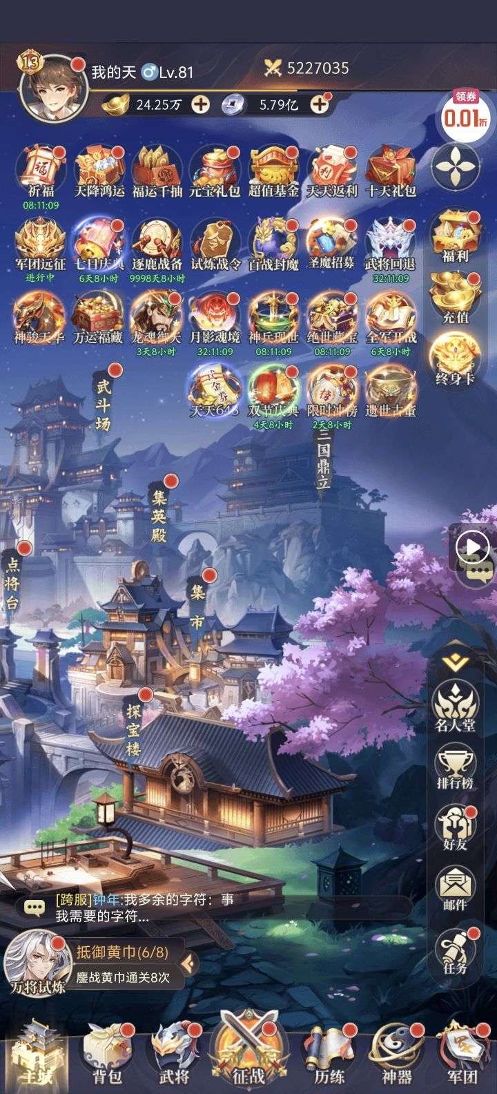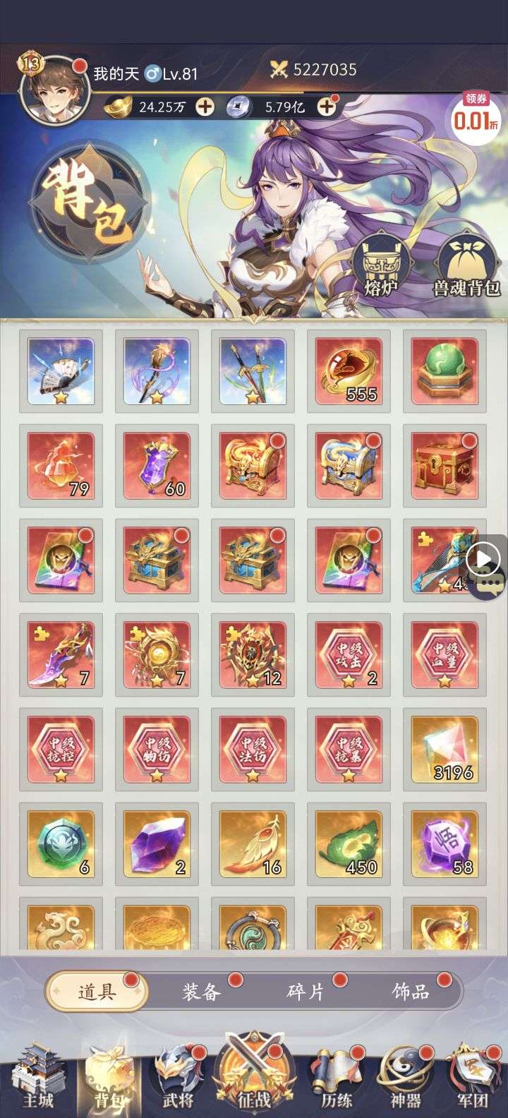 夺宝券*1、比武令*1、5星随机将魂*10(每个账号限领一次)
