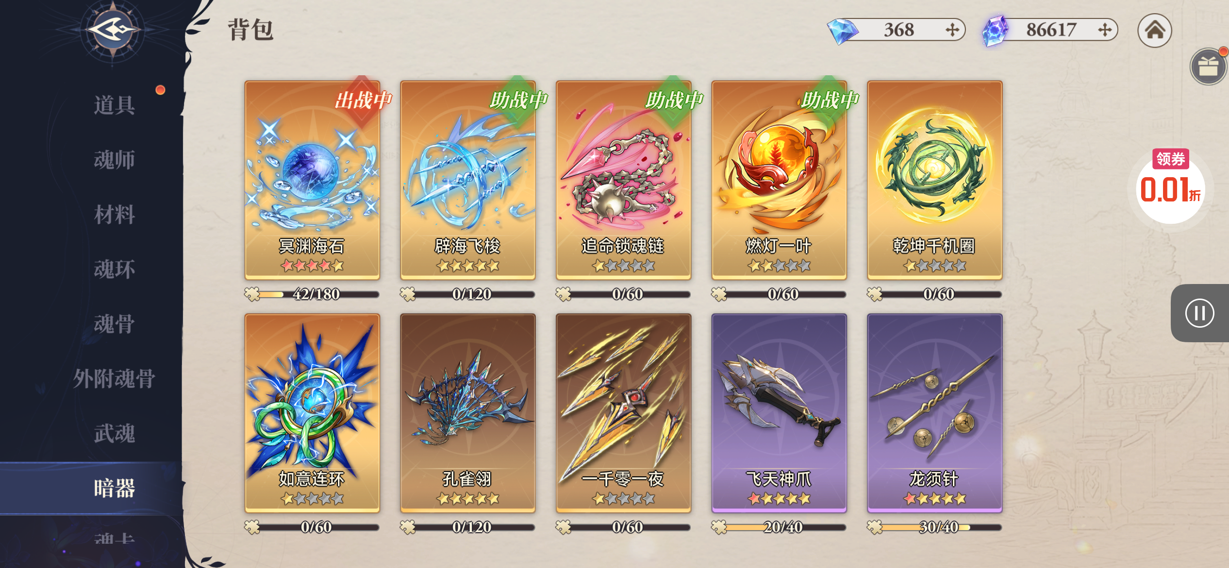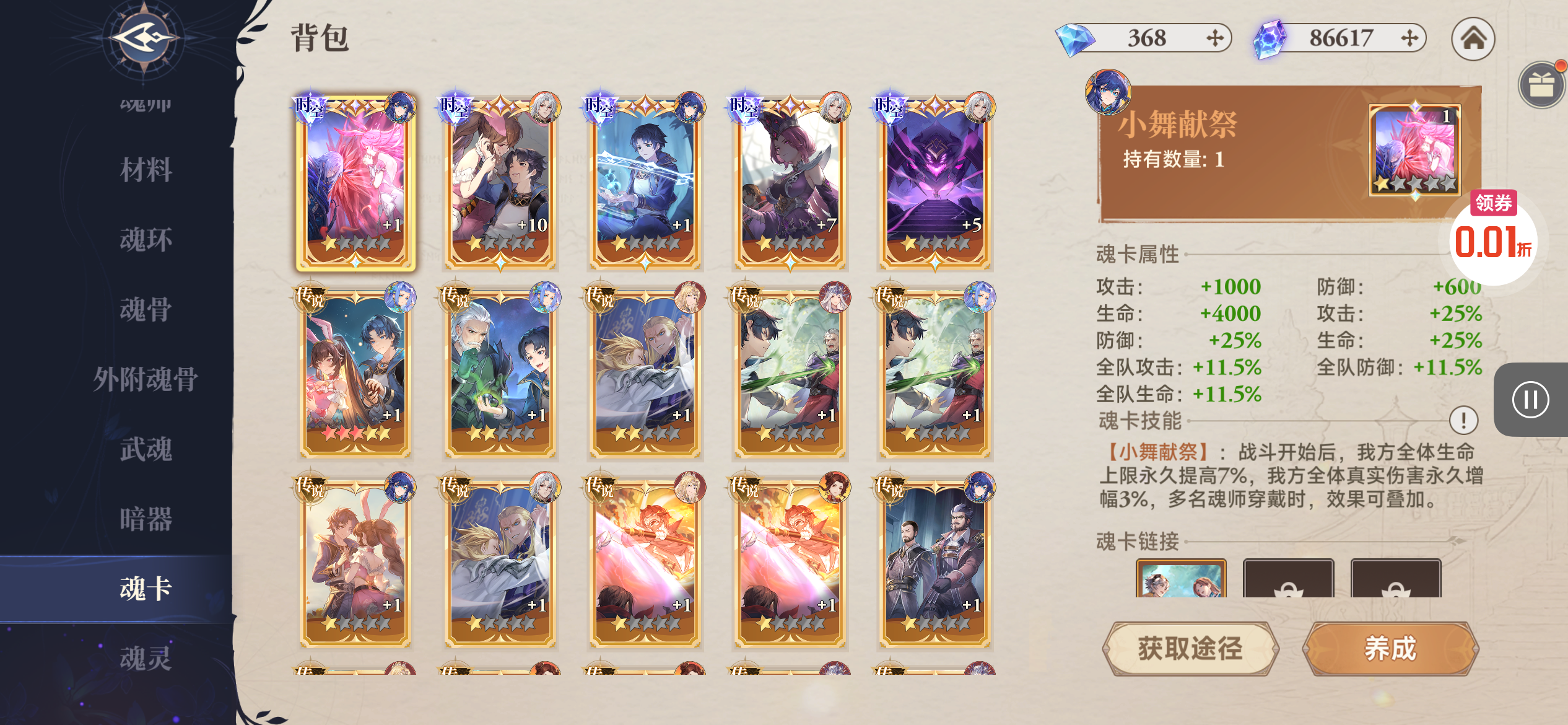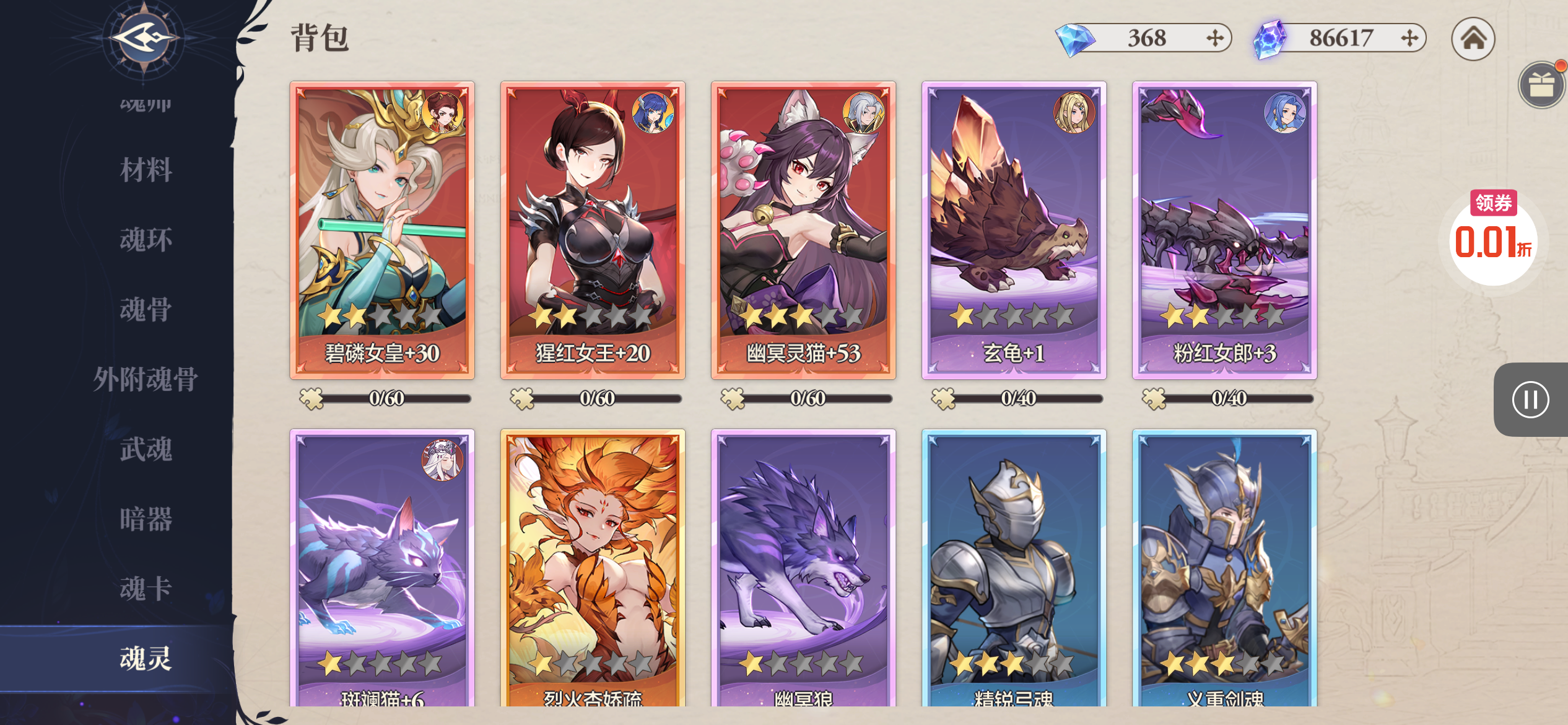 夺宝券*1、比武令*1、5星随机将魂*10(每个账号限领一次)