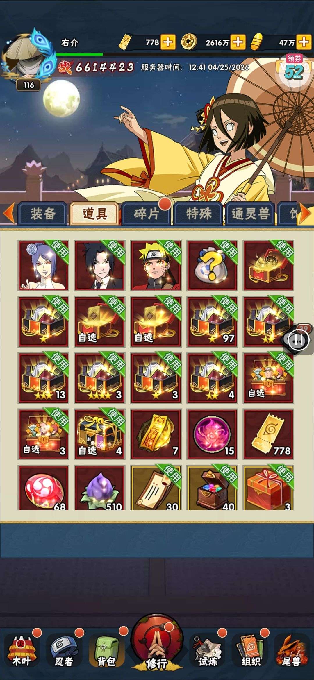 五阵营输出自选包*1、豪华材料自选礼包*2、高级忍法帖*20(每个账号限领一次)