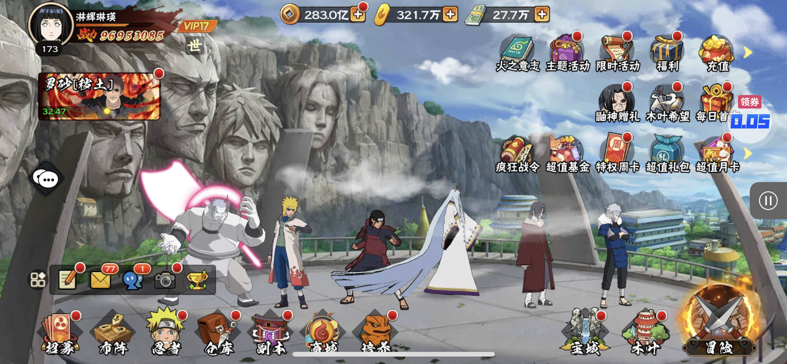 五阵营输出自选包*1、豪华材料自选礼包*2、高级忍法帖*20(每个账号限领一次)