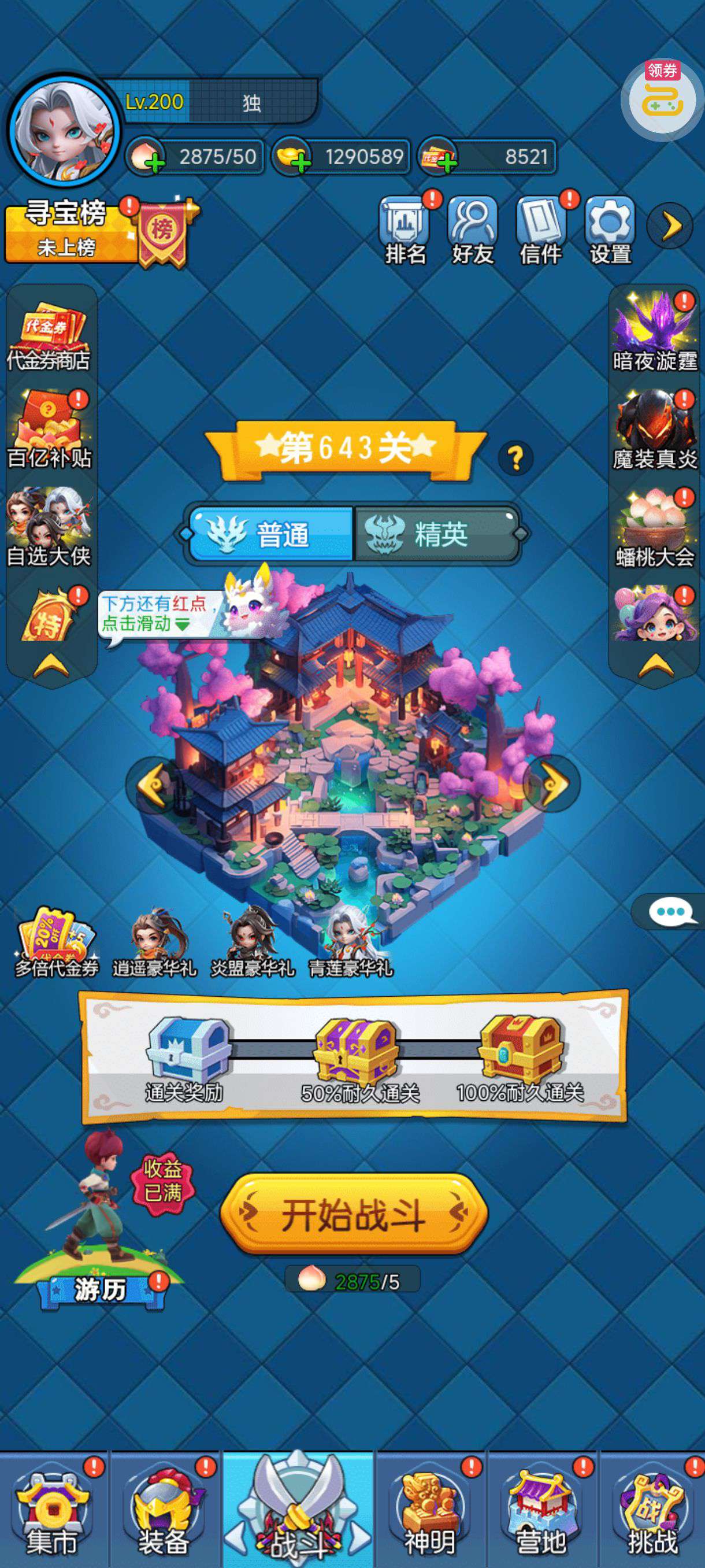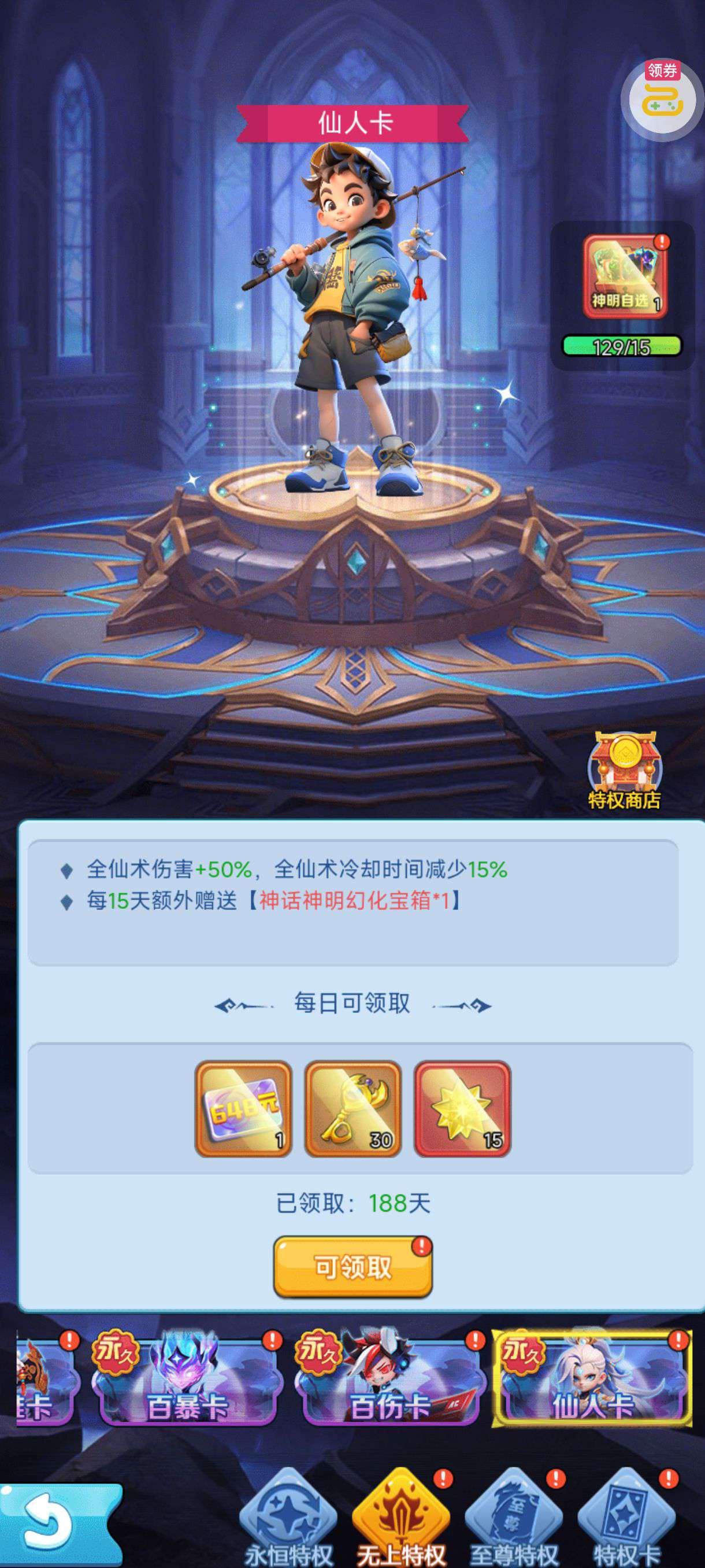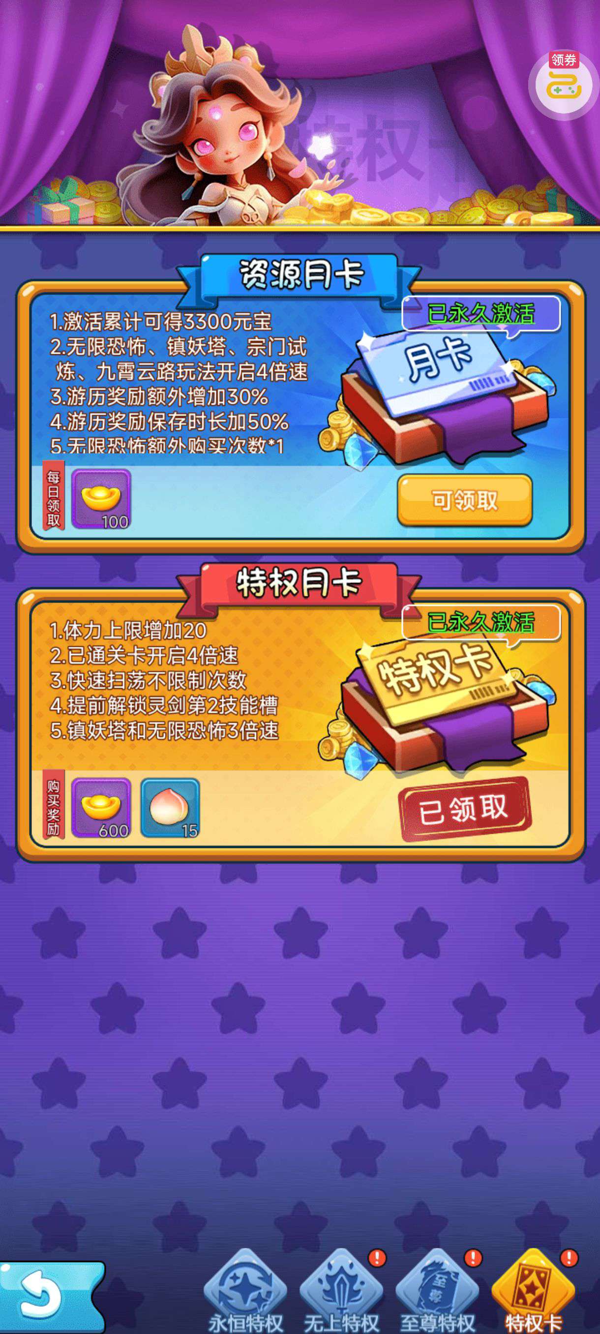 30张648真充卡豪礼、侠客灵丹*10、侠客神丹*10、侠客金丹*1、专属挑战令*1(每个账号限领一次)