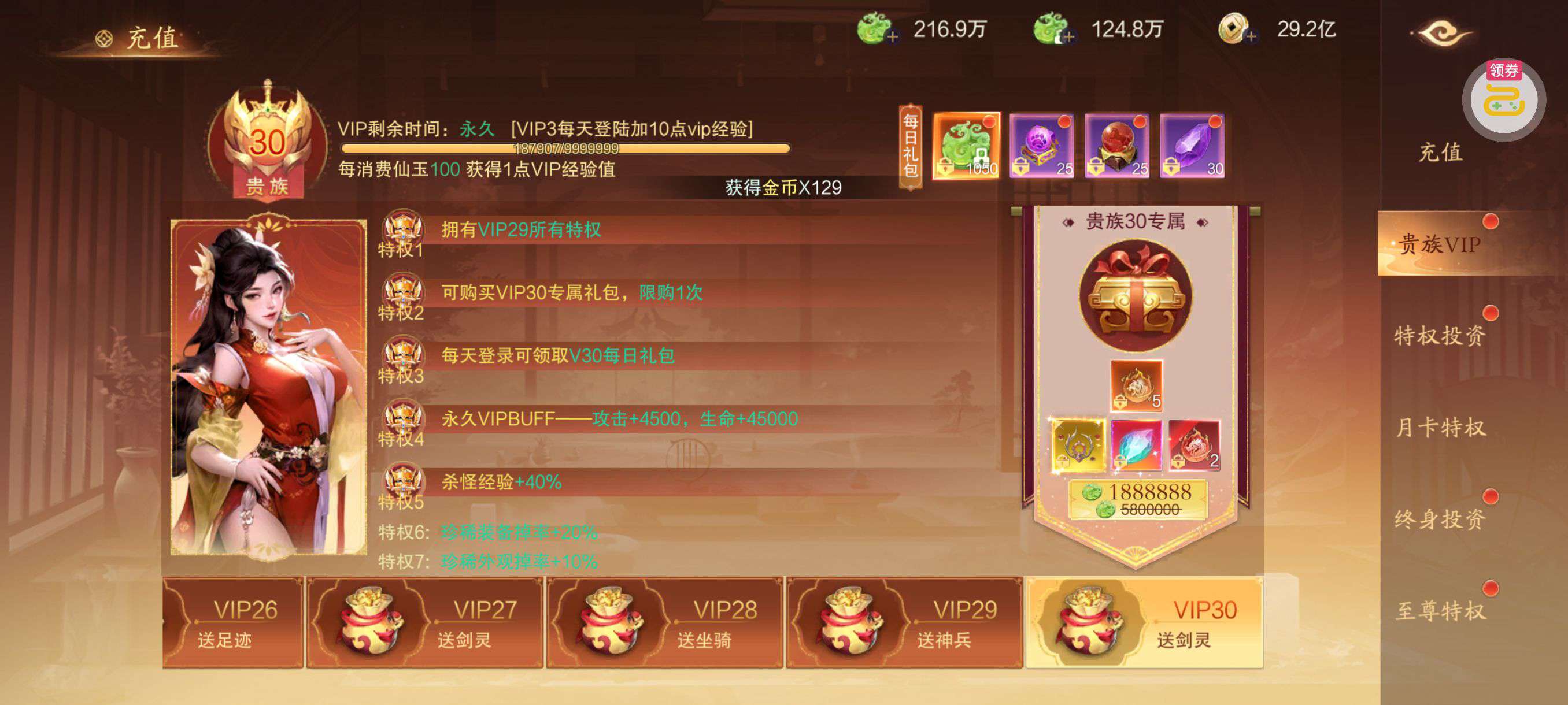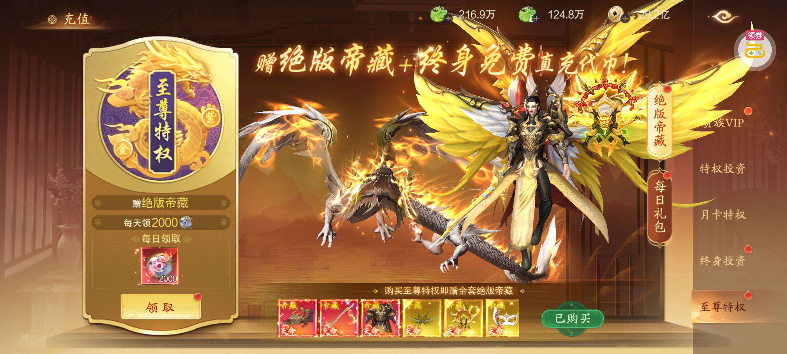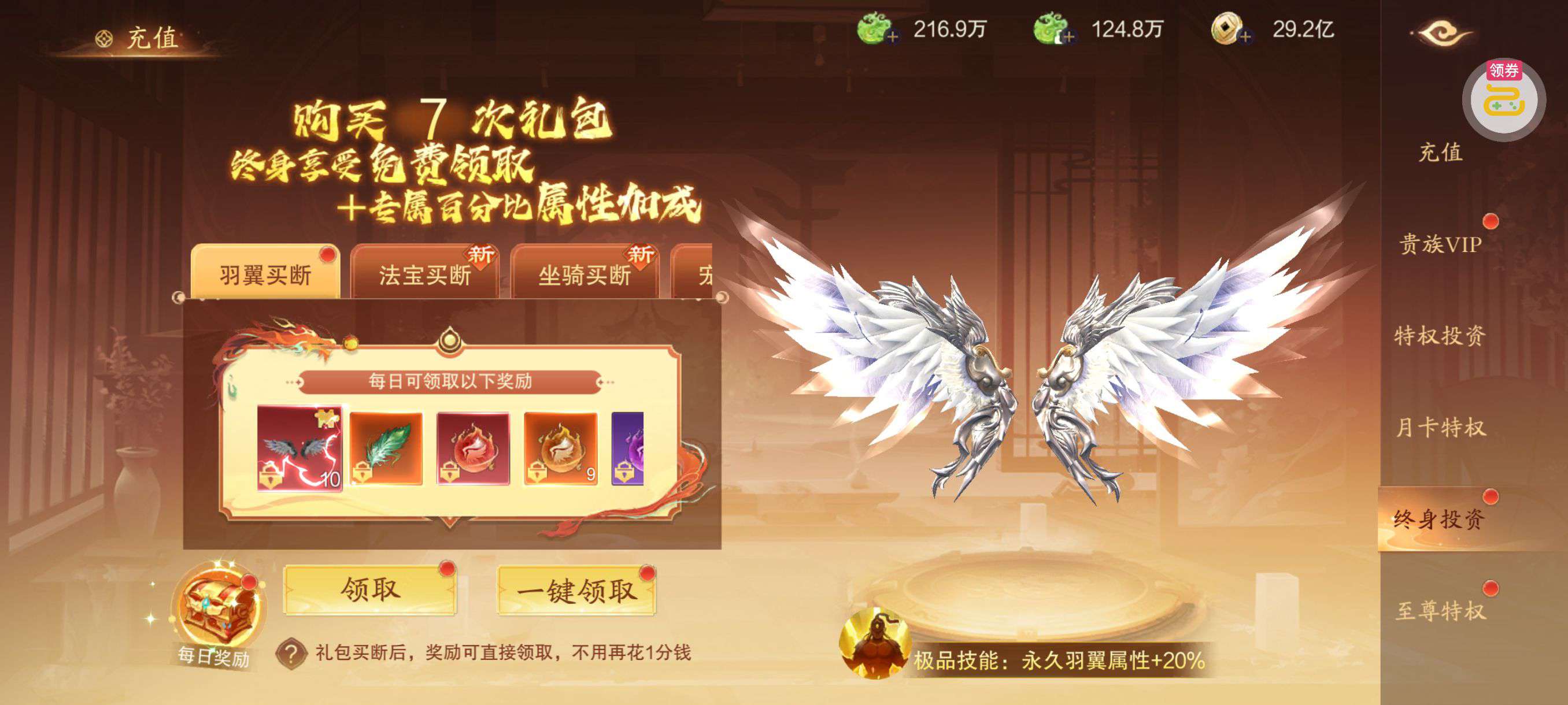 30张648真充卡豪礼、侠客灵丹*10、侠客神丹*10、侠客金丹*1、专属挑战令*1(每个账号限领一次)