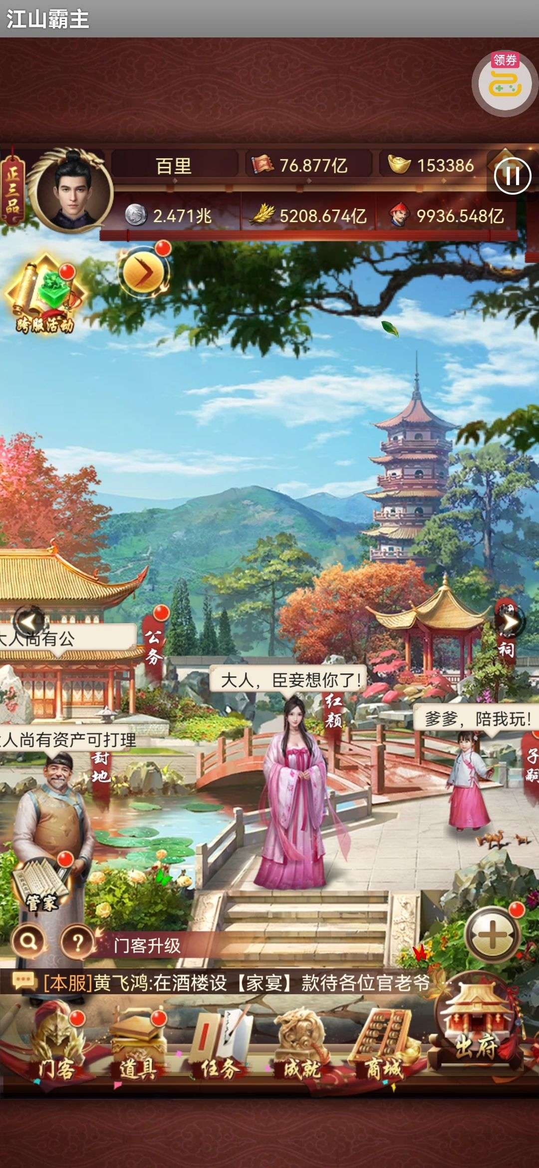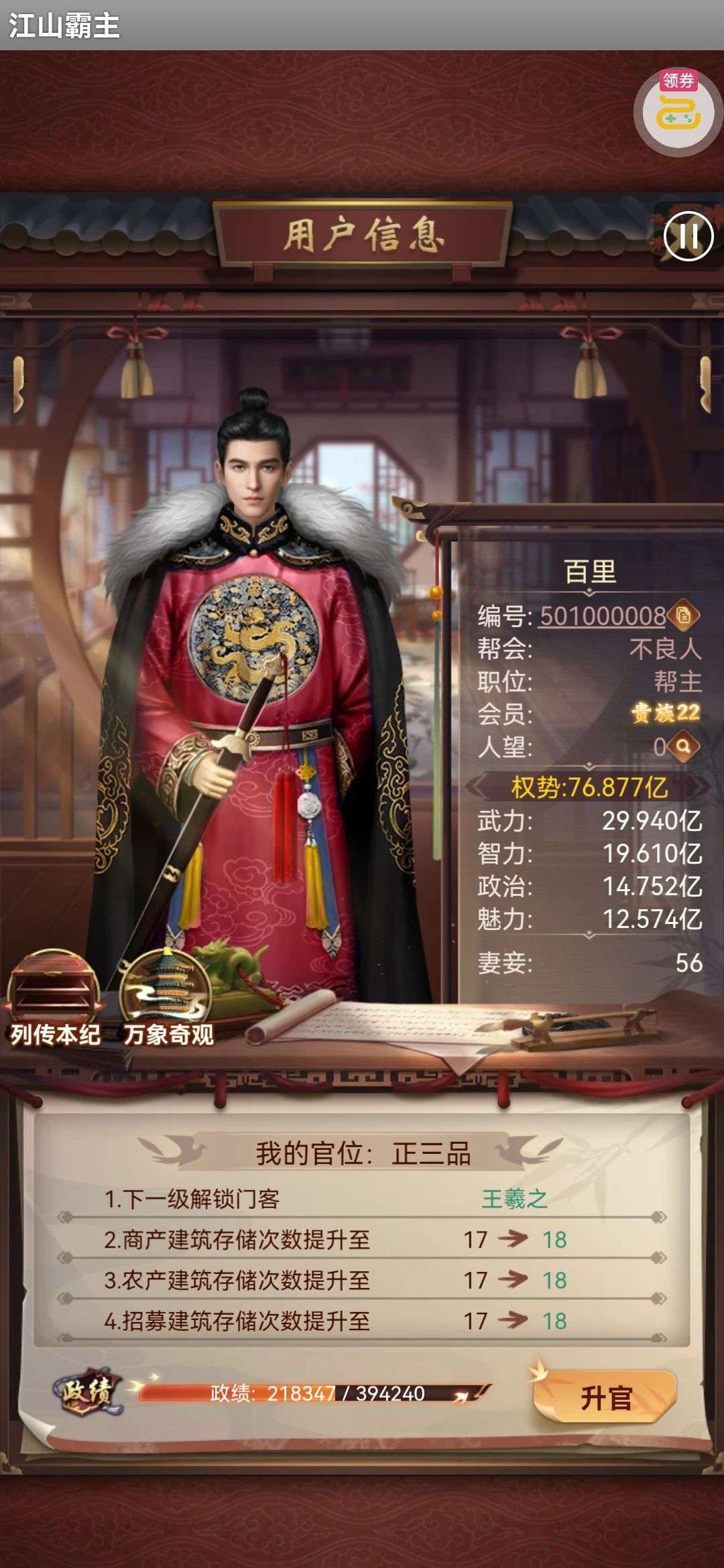 135亿战力。天神将+up将,主妃22w,VIP23。黄金阵容,资源库看图