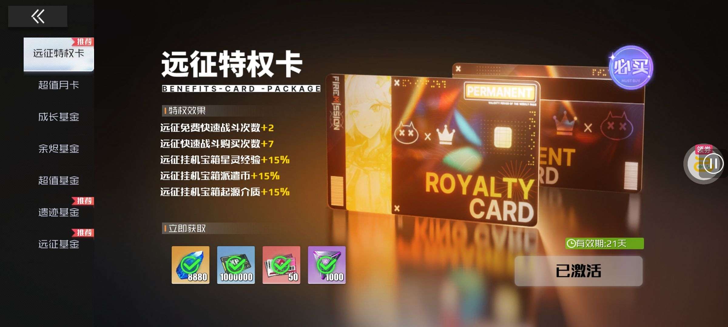 30张648真充卡豪礼、侠客灵丹*10、侠客神丹*10、侠客金丹*1、专属挑战令*1(每个账号限领一次)