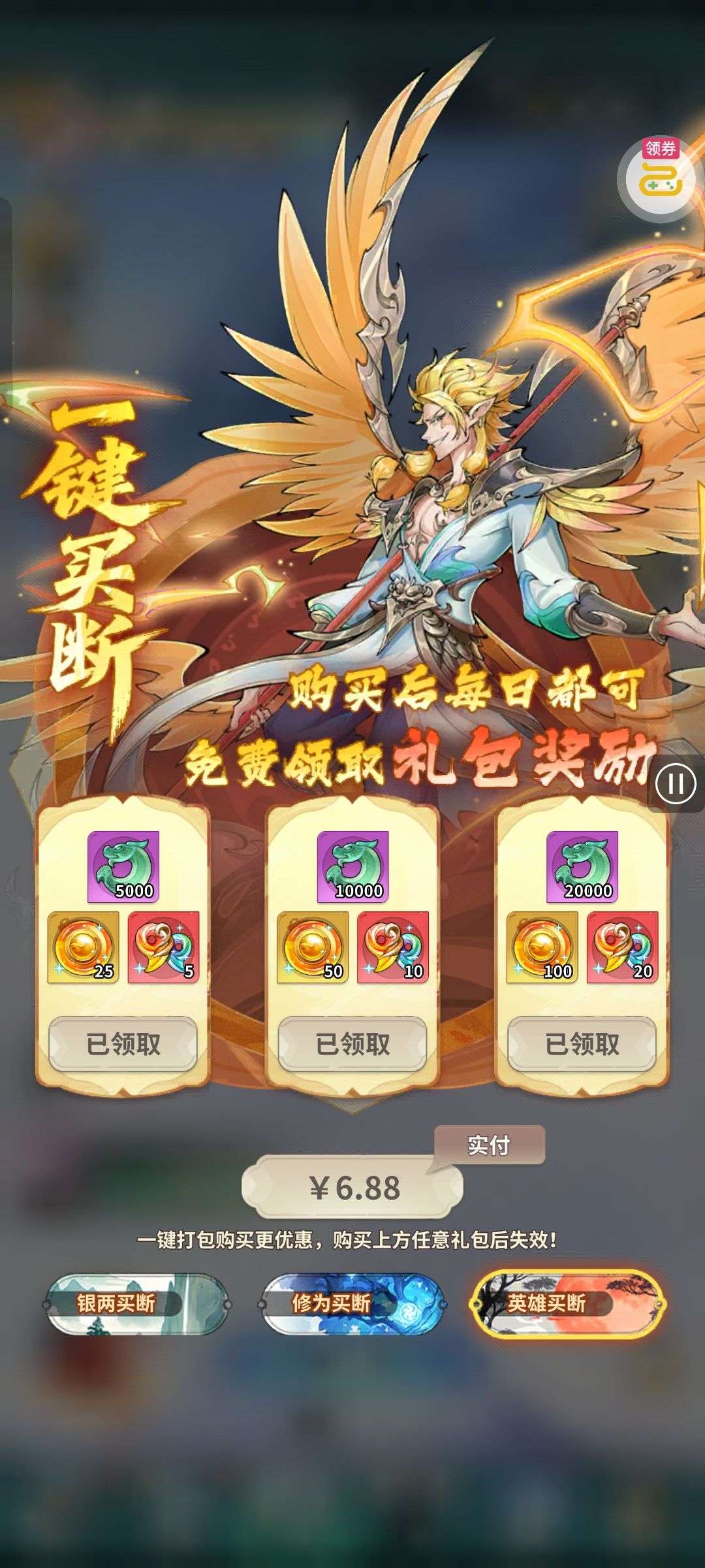 30张648真充卡豪礼、侠客灵丹*10、侠客神丹*10、侠客金丹*1、专属挑战令*1(每个账号限领一次)