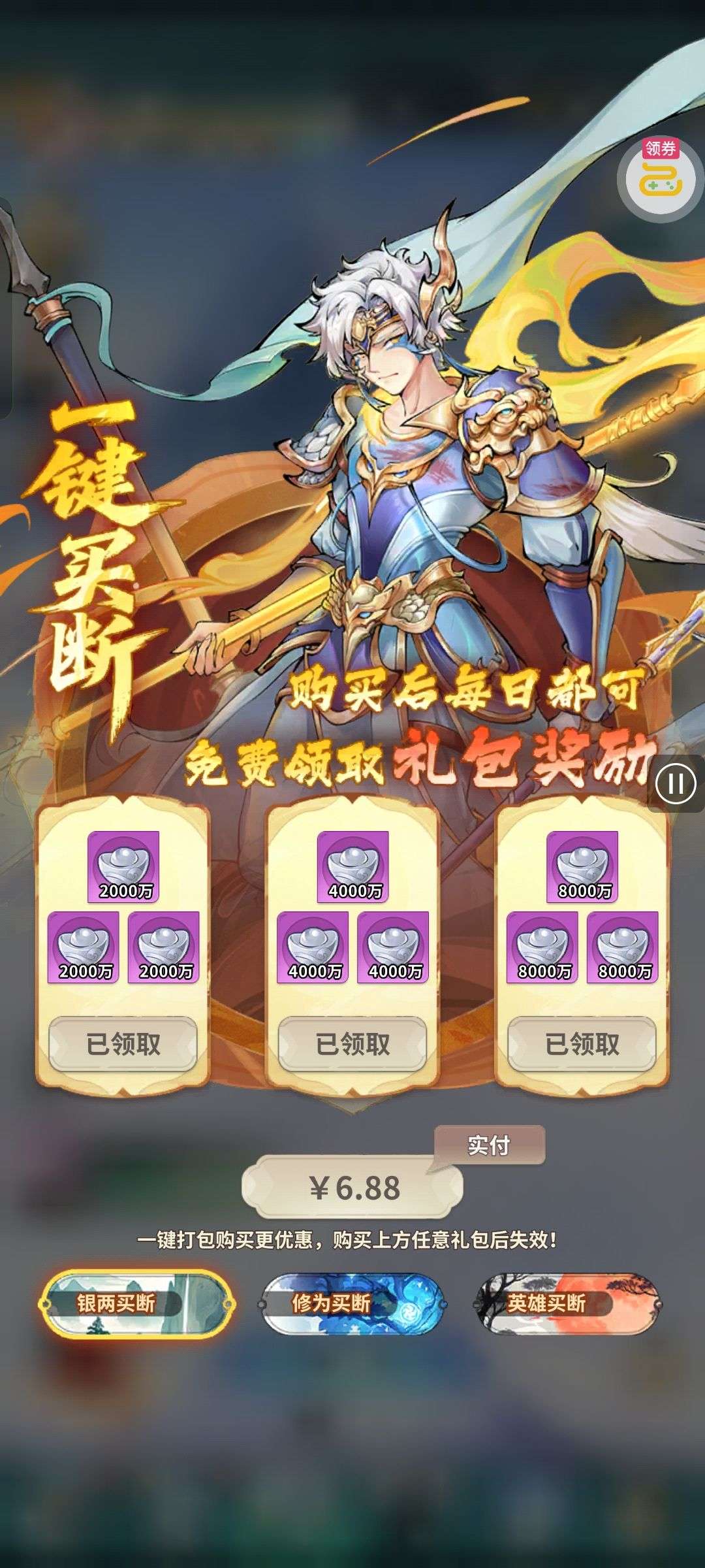 夺宝券*1、比武令*1、5星随机将魂*10(每个账号限领一次)