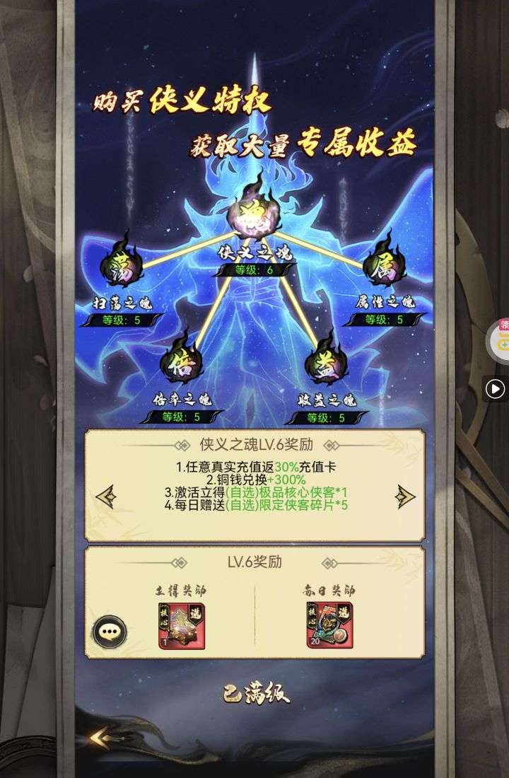 30张648真充卡豪礼、侠客灵丹*10、侠客神丹*10、侠客金丹*1、专属挑战令*1(每个账号限领一次)