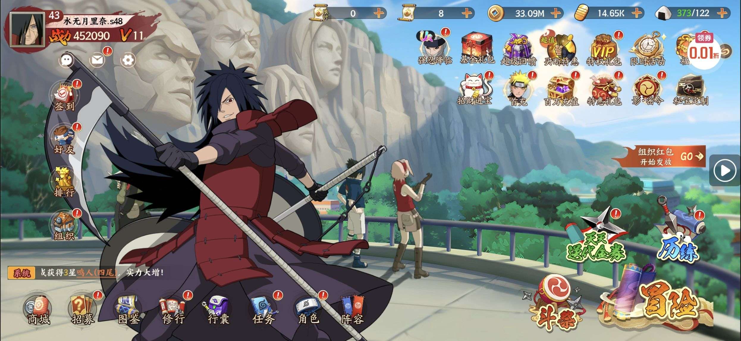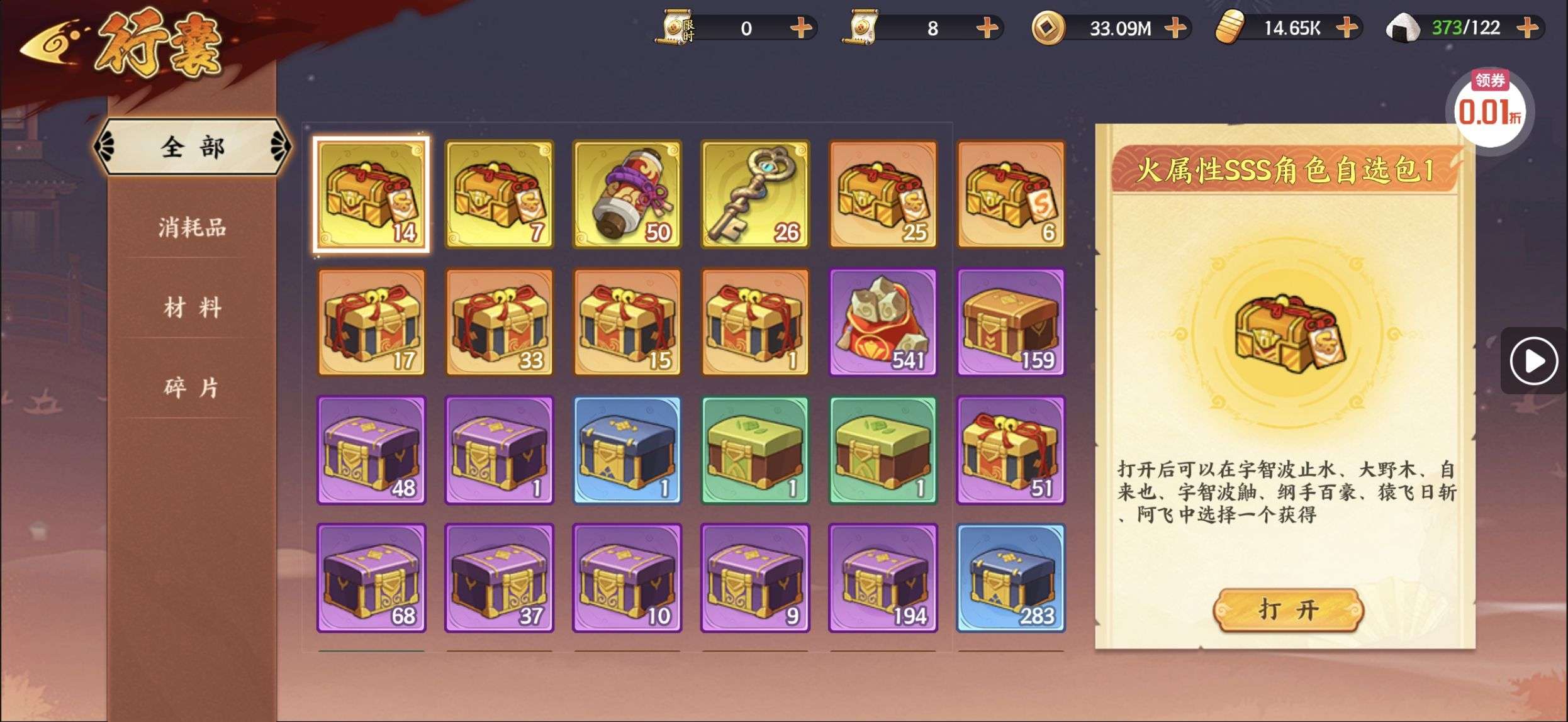 五阵营输出自选包*1、豪华材料自选礼包*2、高级忍法帖*20(每个账号限领一次)