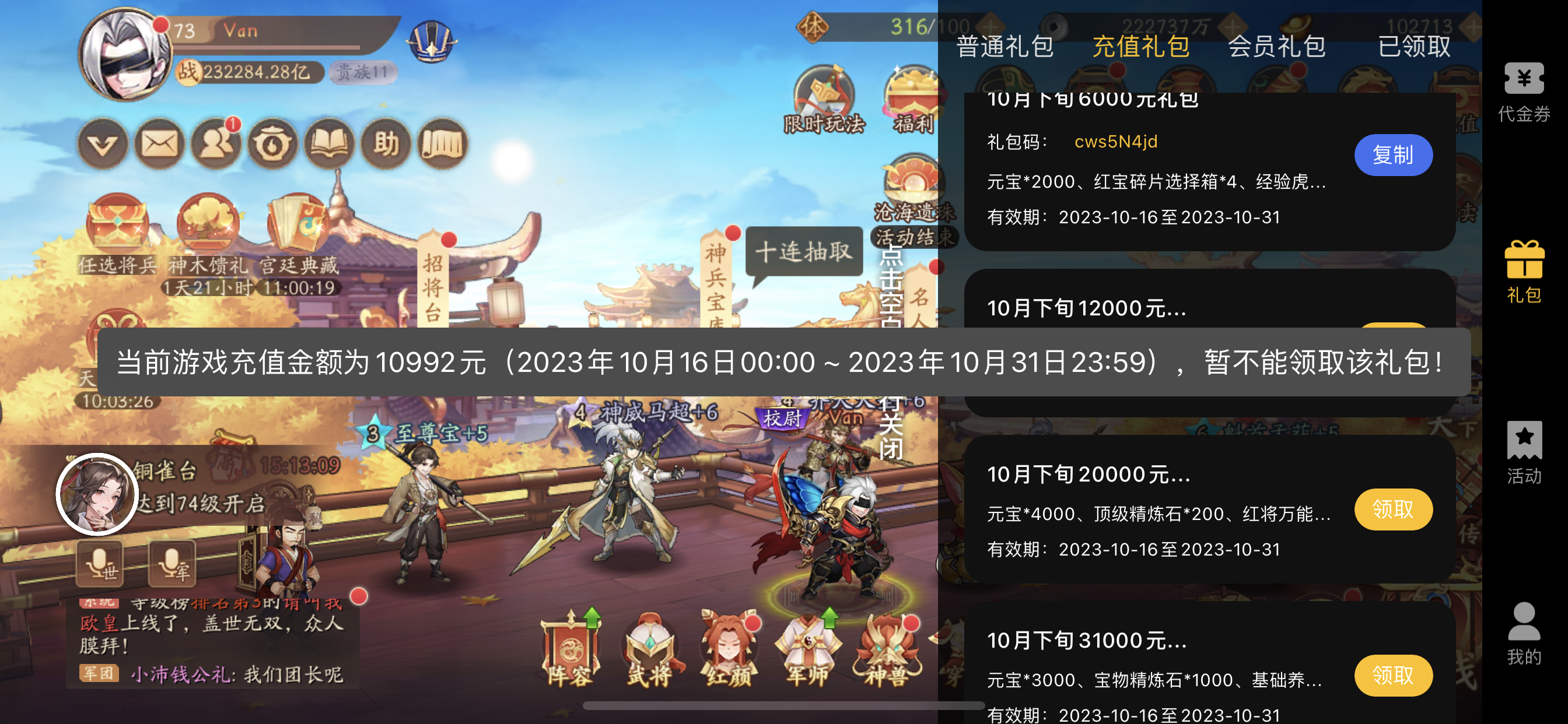 夺宝券*1、比武令*1、5星随机将魂*10(每个账号限领一次)