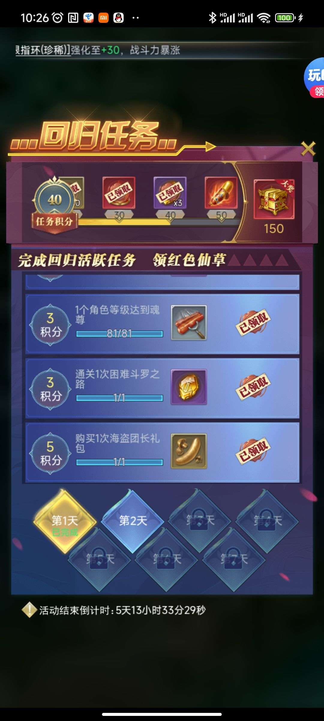 夺宝券*1、比武令*1、5星随机将魂*10(每个账号限领一次)