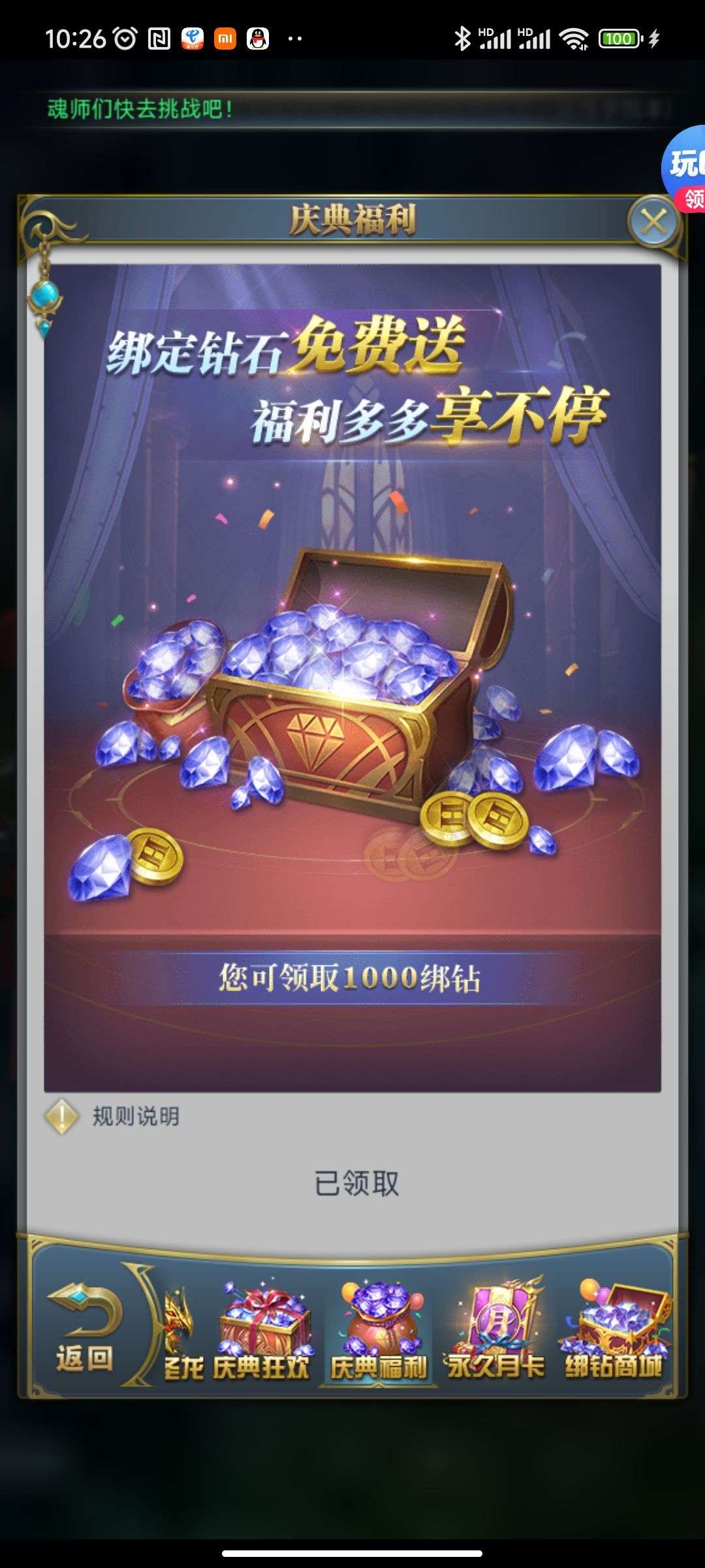 魂晶*888,魂师召唤券*10,武魂水晶*5(每个账号限领一次)